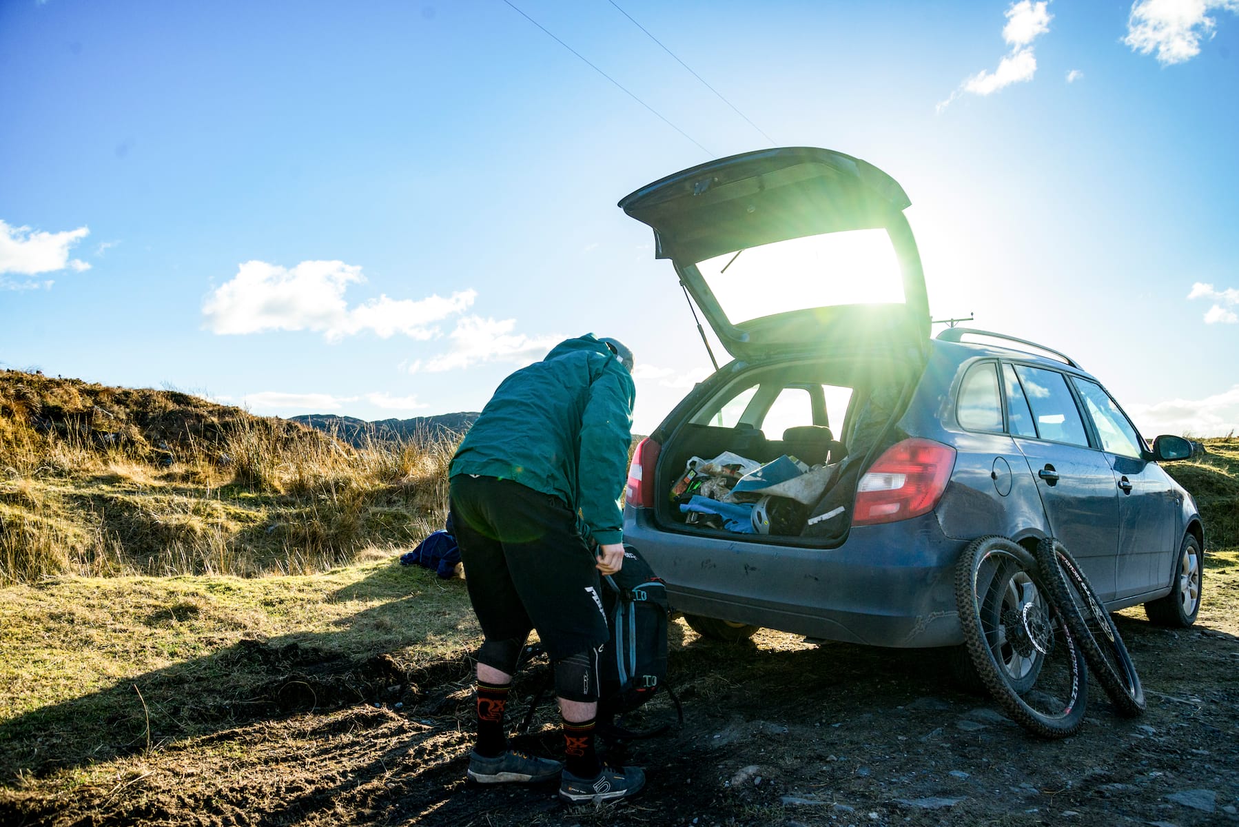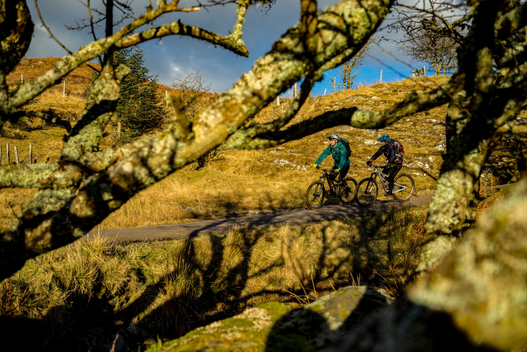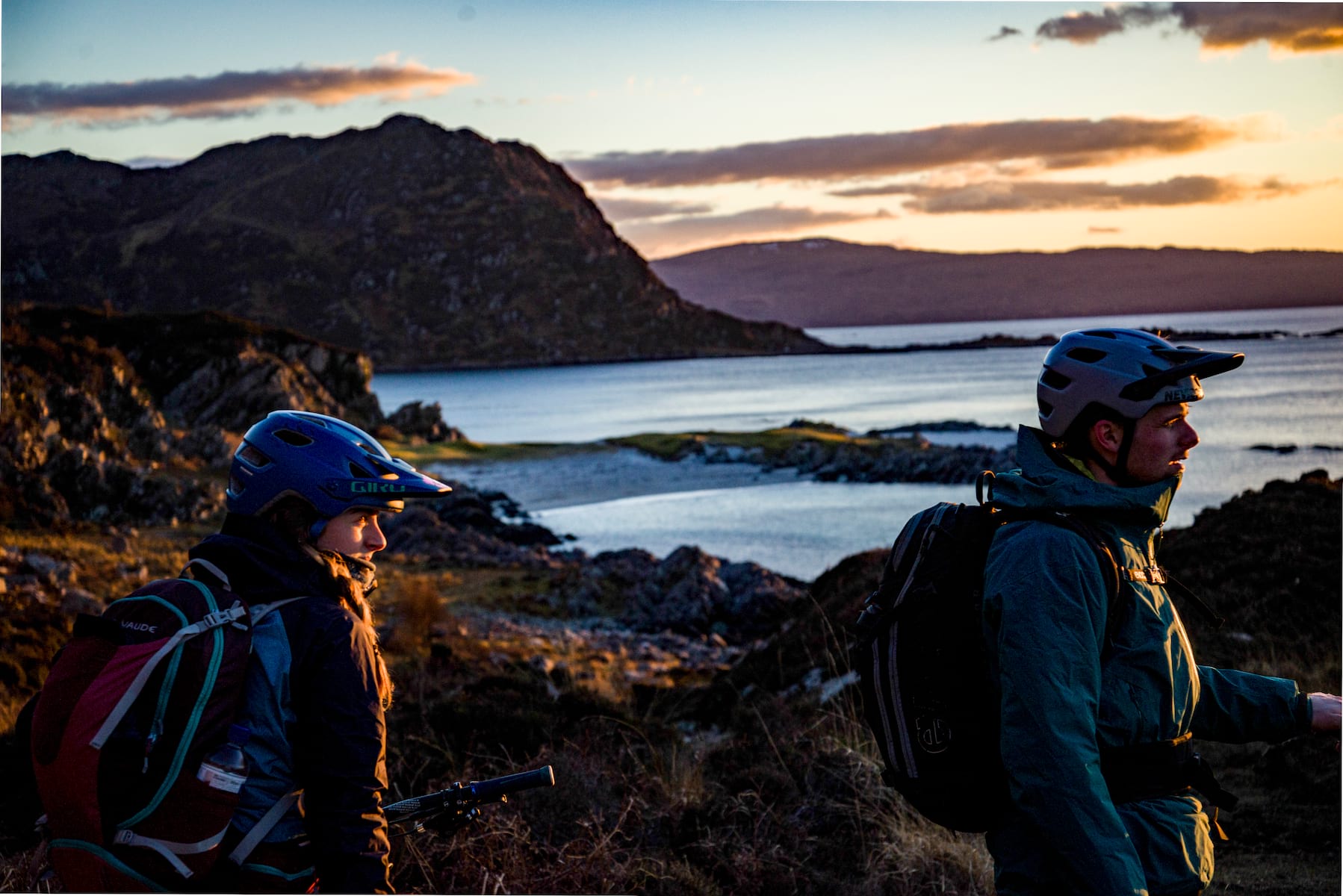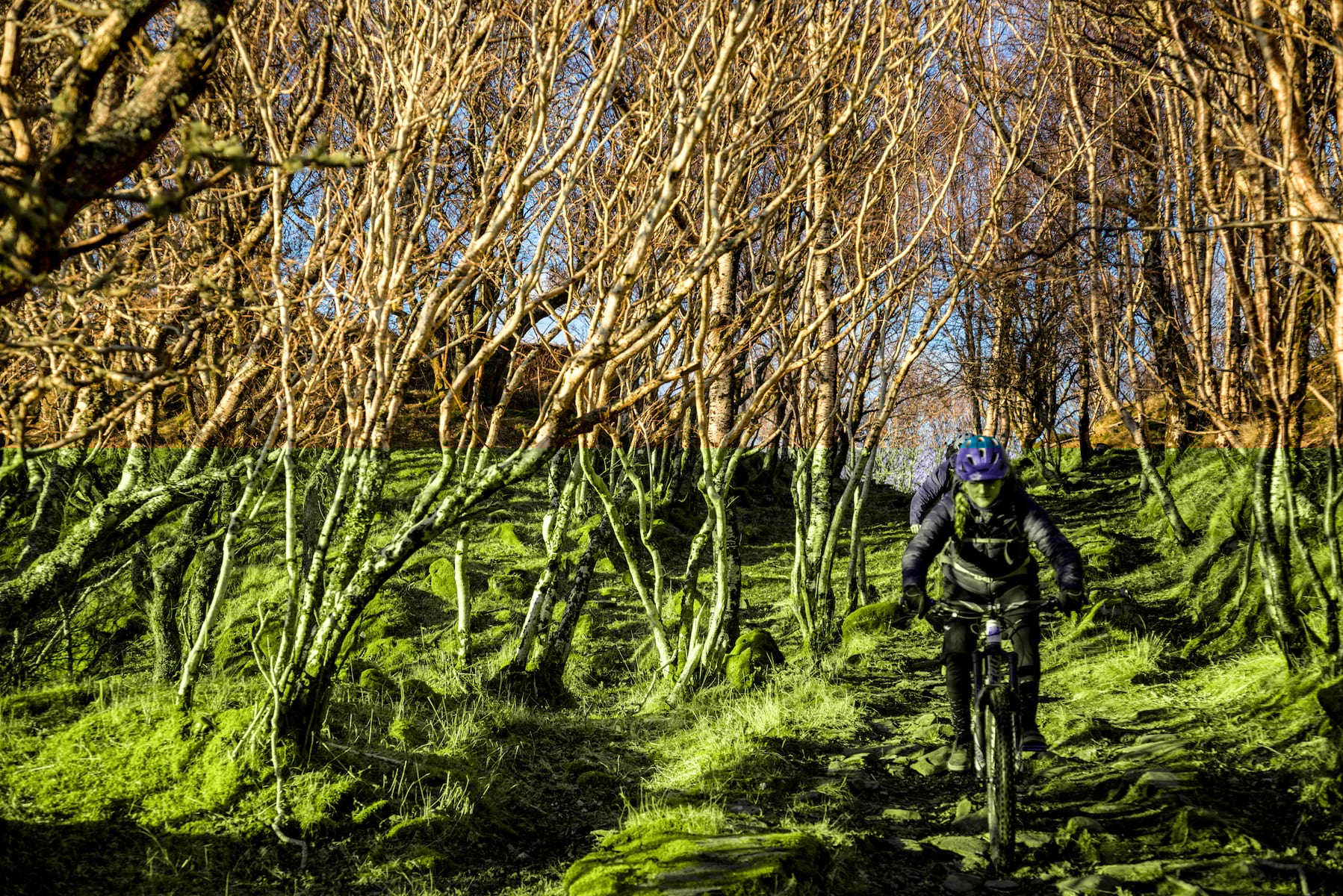 Tyres skitter to find grip under braking as Miles and Mikayla make haste through the birch, while the wind howls overhead. Dappled light makes the going difficult with the falling sun casting dark shadows in between its golden rays. The fast singletrack is, however, short-lived, but what it lacks in quantity, it more than makes up for in quality.