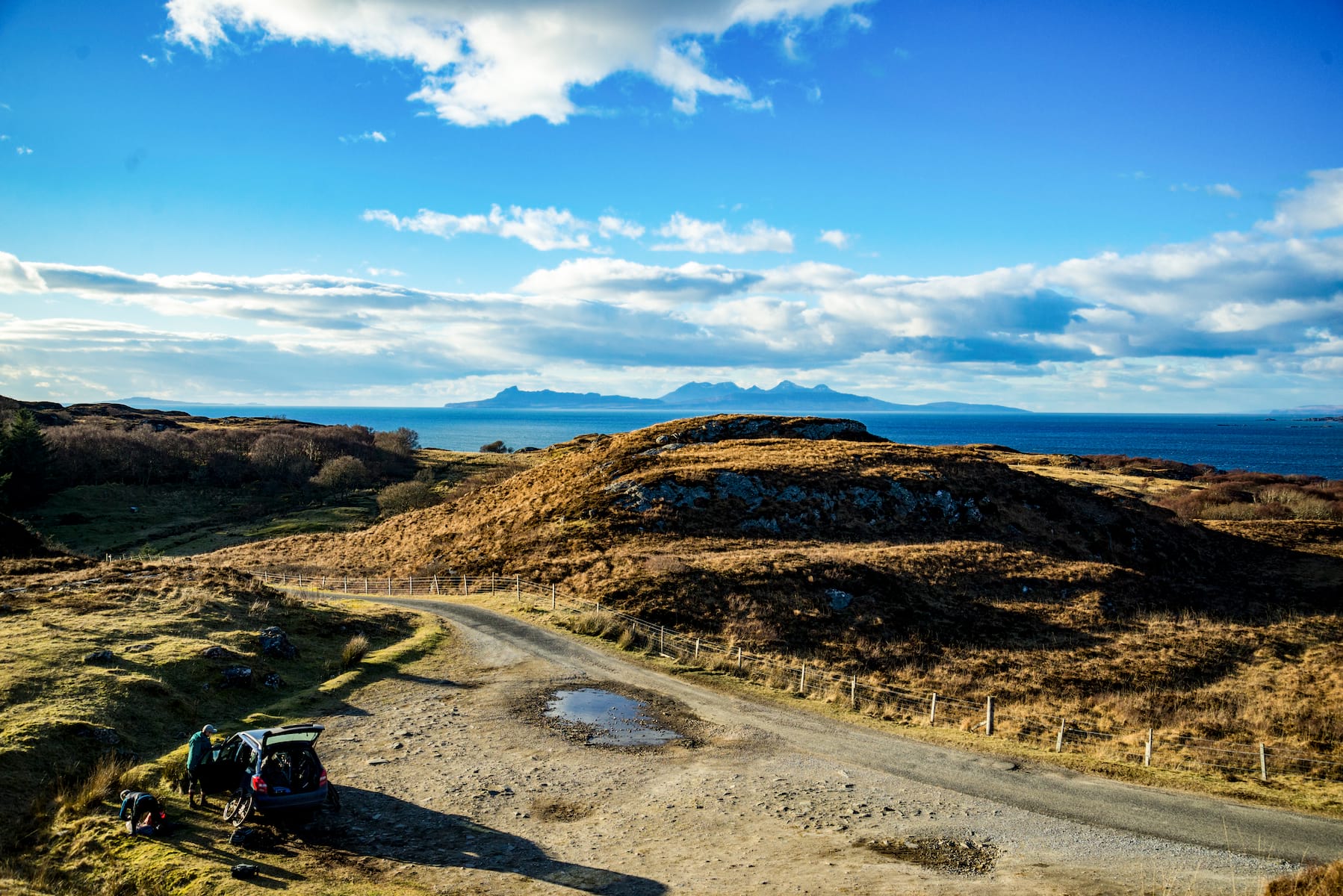 The tortured sound of tyre churning frozen bog is the only thing that rises above the din of the Siberian wind urging us south and west. Thankfully, that’s the direction we want to be heading in so we’re grateful for the gentle push. It’s hard to overstate the view to our right at this point. To our left is the tall hill that marks the end of Scotland and the start of the Atlantic Ocean – we’re on a sliver of land that lies between the two. To our right is North America, with Scotland’s smaller islands providing intimidating fixtures on the near horizon.