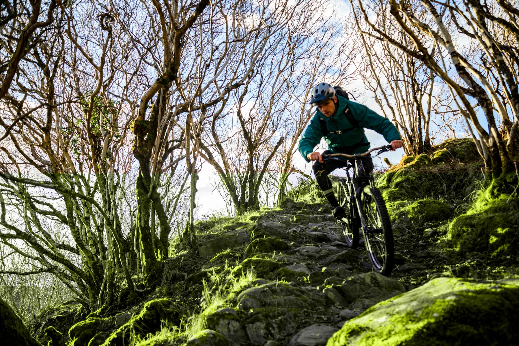 Fast, flowy turns carved down the open field soon give way to trackstands and leg-dangling as duckboards are the only route across the bog at the bottom of the field before we swing high to stay above the cliffs that approach ahead of us.