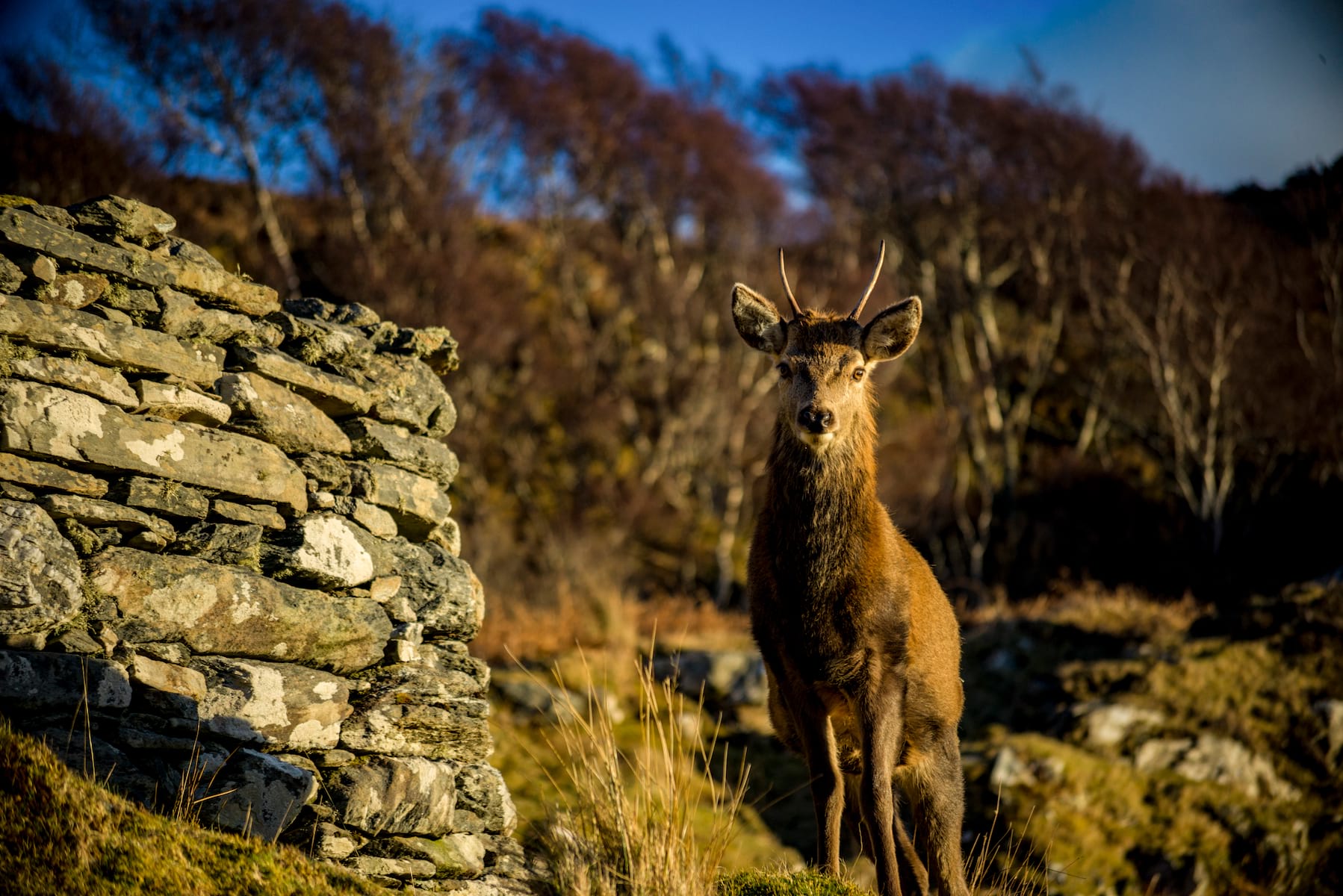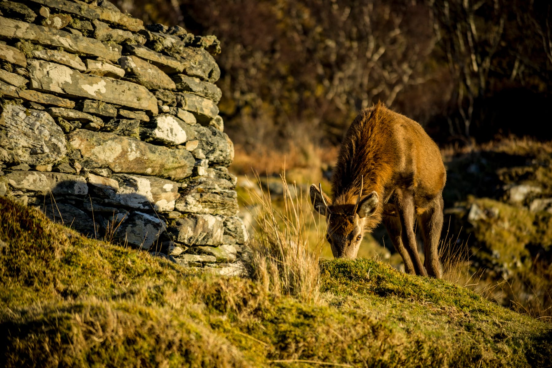 As we reach the first of many crofts, we stop to take in the view and work out where the path goes in this open field that looks freshly mowed. As we slink around the stone walls of one of the smaller crofts, a young red deer buck stands to attention, clearly not fazed by us at all, taking a moment to clip some grass before scratching behind his ear.