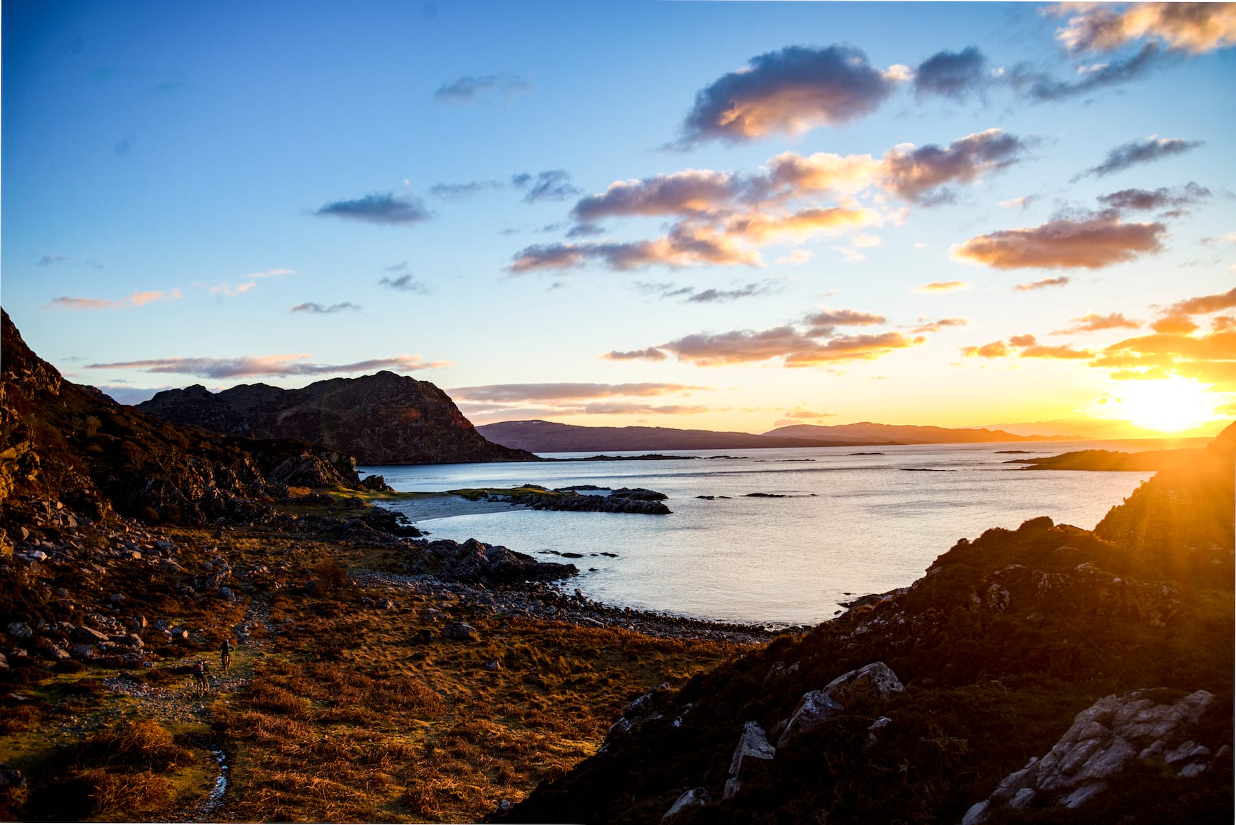 Finally, we have our overnight spot in sight. Bright white sand slips into turquoise water under dark cliffs as the sun starts its distant lap of the horizon. Once last clatter along the rocks that must have made up yet more crofts, ghosts of a bygone age before the Highland clearances.