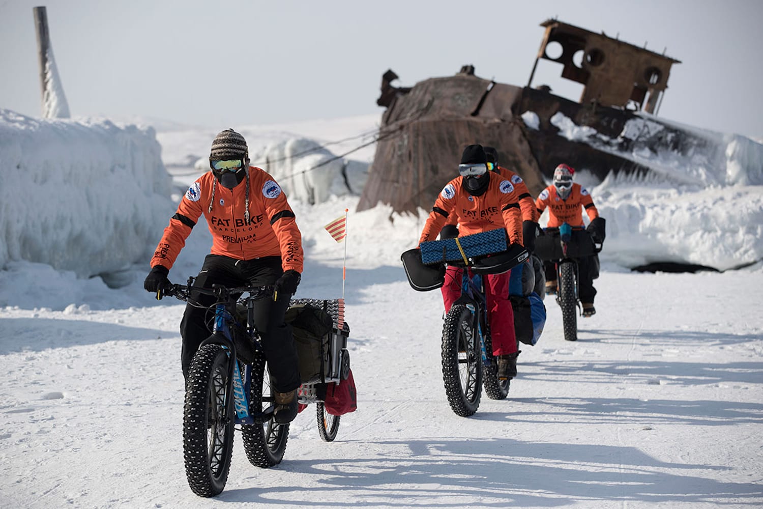 As we moved forward, small tongues of snow on the ice became larger and larger, this slowed us down. The wind became stronger so it was almost impossible to pedal. Our hands and feet have been fully frozen because of the coldness.