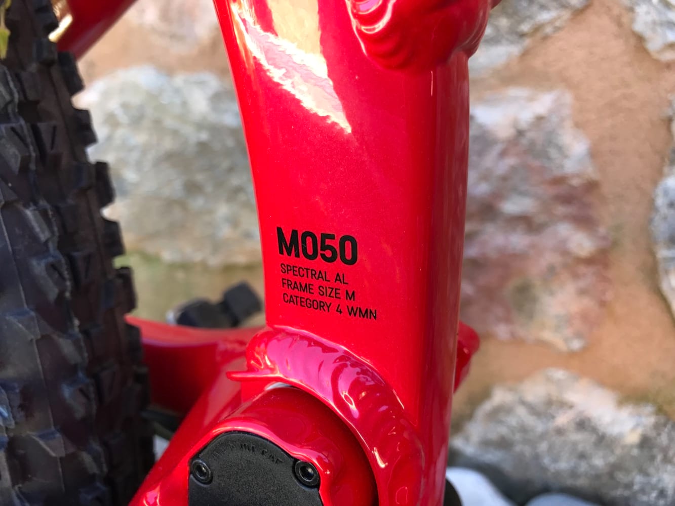 Our test bike is the AL 6.0 – the top aluminium spec, in a rather fetching coral paint job (that’s a slightly pinky red to you and me). As all Spectrals it’s a 150mm FS 27.5” trail bike. The AL 6.0 is equipped with Fox Performance EVOL Float shock and 34 fork, the virtually ubiquitous SRAM GX Eagle shifting and Guide R brakes, DT Swiss M1700 Spline wheelset and Race Face alloy finishing kit. Published weight for the small is 13.4kg (we’ve yet to stick this medium on the scales).