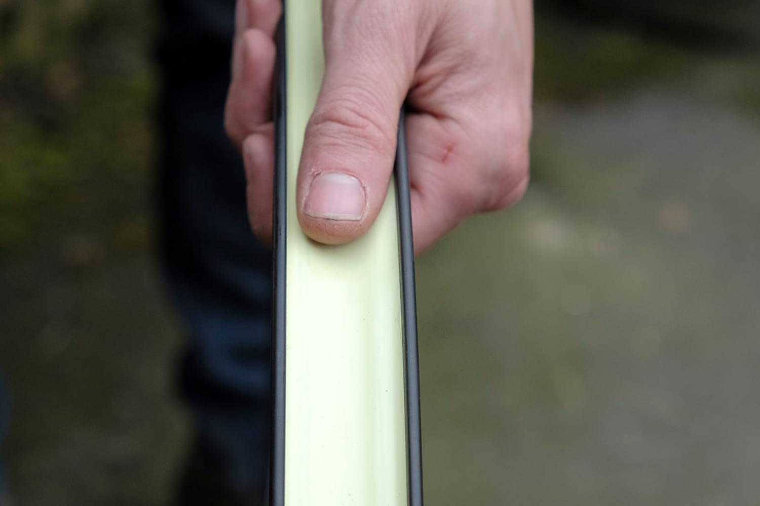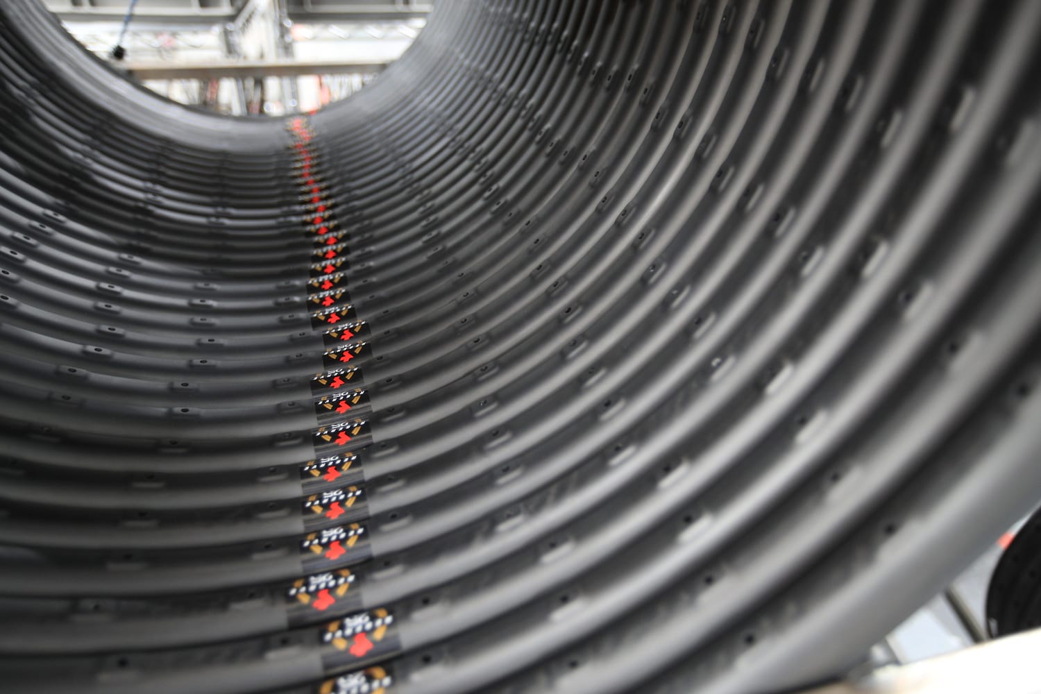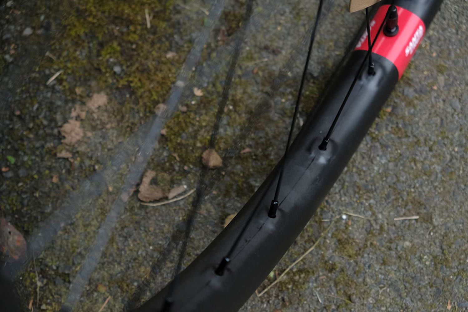 Each rim gets offset spoke drillings, which helps to provide even spoke tensions from drive to non-drive side. The spoke beds are reinforced with extra thick carbon fibre, but only in a small square patch around each spoke hole. This way the strength is applied where it needs to be, without adding extra weight to the rest of the rim.