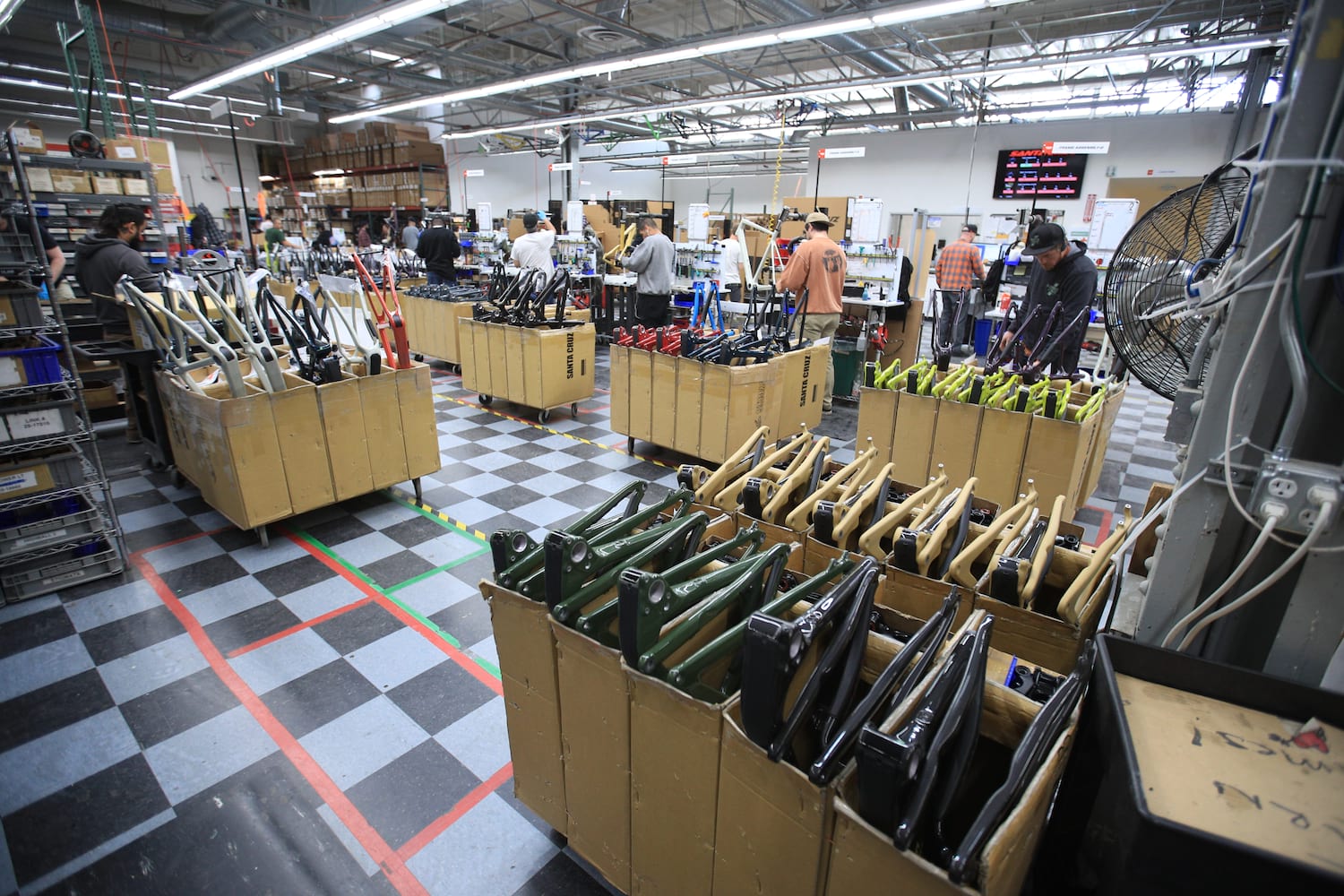 During the recent launch for the brand new Blur and Highball, I enjoyed an entertaining guided tour through the Santa Cruz factory by the company’s CEO, Joe Graney. For anyone who’s visited the Santa Cruz’ Mission Street factory before (visitor tours are run every weekday), you’ll know that Santa Cruz does all of its bike assembly in-house, rather than out of Taiwan or China like most other brands. The big warehouse is like a novelty supermarket filled with ceiling-high racks chock full of swingarms, linkage kits, bearings, forks, brakes, cassettes, cranksets, handlebars, grips, headsets – and all of the other goods needed to create a complete bike. The main workstations are a hive of activity each and every day, where bikes are built up, wrapped up, then boxed up in preparation for being shipped out to a Santa Cruz dealer somewhere around the world.