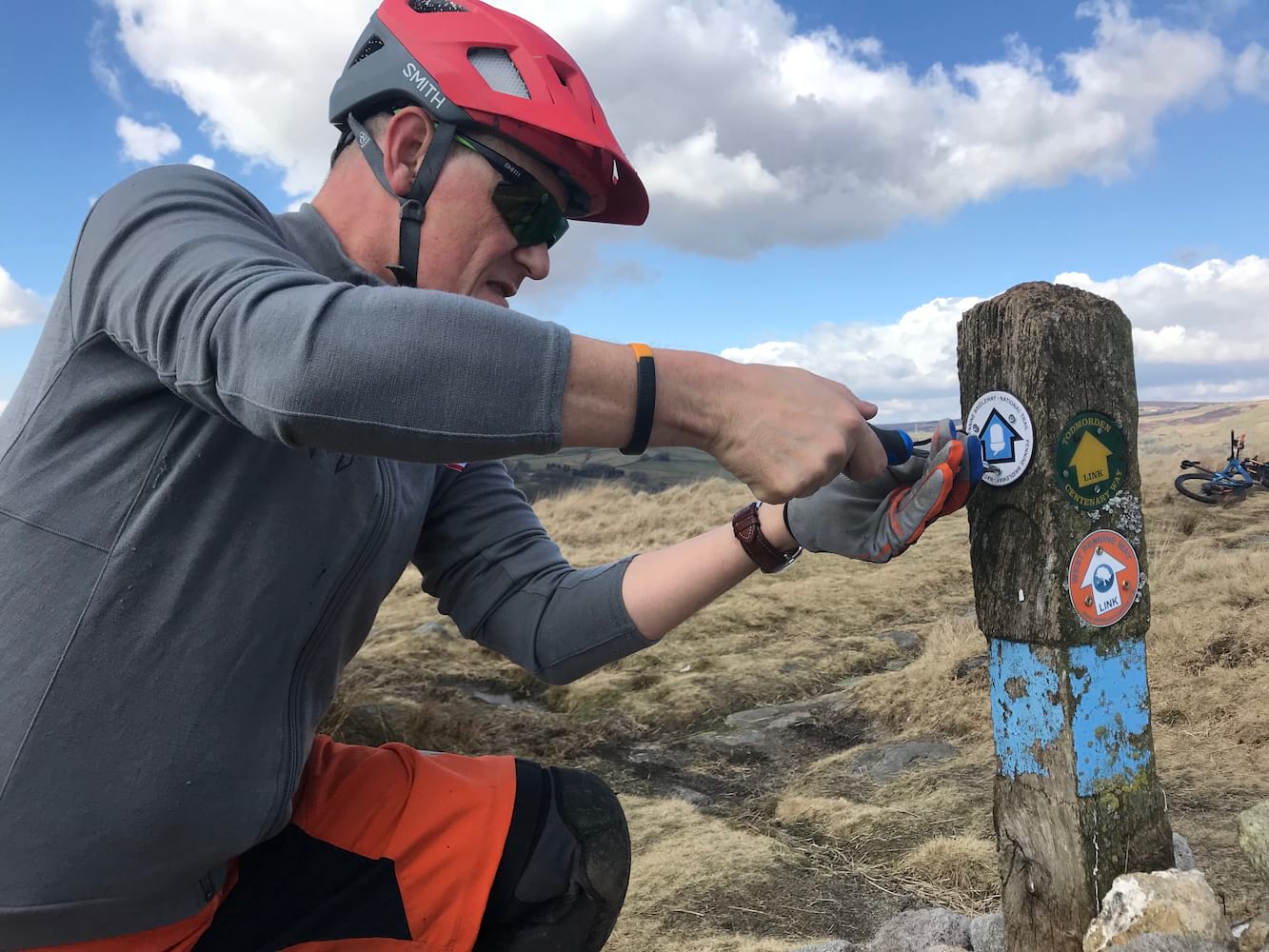 Chipps, meanwhile, has been zipping around on a secret new test bike that he can’t tell you about until 4pm today (stay tuned, folks!) but this has fortunately involved taking in some favourite trails in some great weather. He also used this opportunity to do a bit of signpost maintenance, having been loaned the ‘Mary Towneley trail maintenance kit’ by Bill the Ranger. It consists of a bunch of new signs, a screwdriver, some spray grease for gate hinges and the air of someone who’s supposed to be attacking marker posts with a tool…