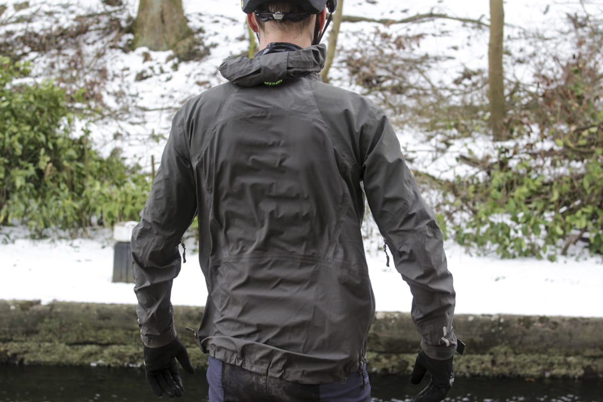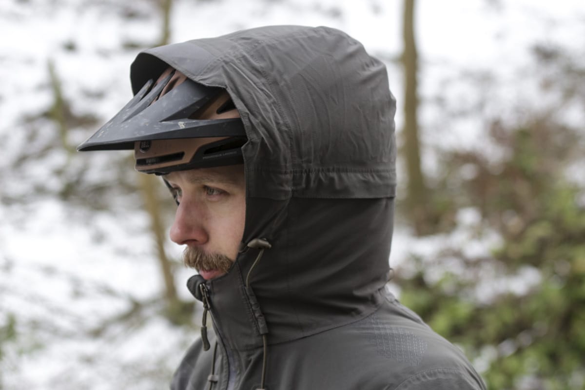 There’s an integrated hood, which is just big enough to fit over a trail helmet. You certainly don’t have to worry about the hood coming off on its own, and with the front zip done up, flappage is all but eliminated. If the conditions are particularly blustery, the hood can be rolled up and stowed inside the neck collar. When rolled up however, the hood can feel a little bulky and stiff around the back of your neck.