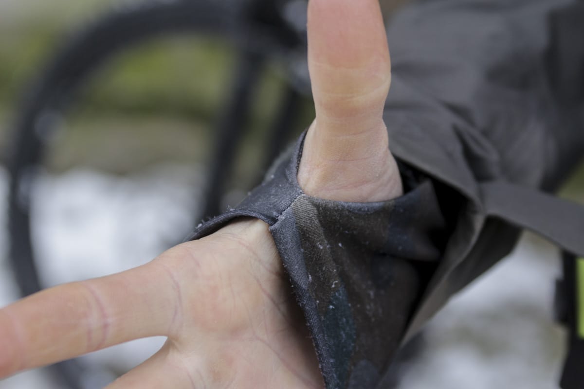 The other option is not to stick your hands through the stretch cuffs, but then the jacket sleeve tends to ride up and expose the internal cuffs to moisture. And once those cuffs get wet, they’ll draw moisture up onto your arms. On one ride, bizarrely I ended up with wet shoulders, because my merino long sleeve base layer had drawn water all the way up the arms.