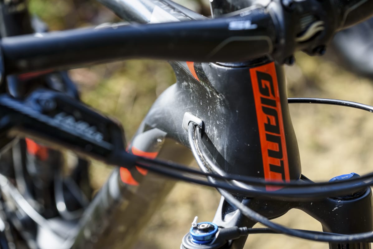 Boost hub spacing features front and rear, with low-profile axles locking down each wheel with a 6mm hex key. Out back, the one-piece carbon swingarm claims to save 160g over the alloy version, and it joins to the mainframe via two small links. The one-piece rocker link drives the shock via a trunnion bearing mount for smoother rotation, and Giant has also employed a longer stroke metric shock to help lower the overall leverage ratio. To minimise moving parts, the lower shock mount shares the same pivot as the lower linkage. This little pocket formed an idyllic habitat for water and mud during our damp Autumn conditions though, and it’s a pain to clean out.