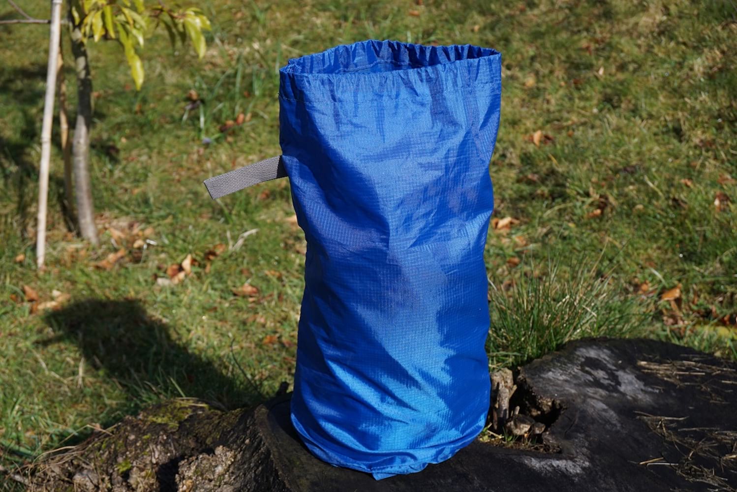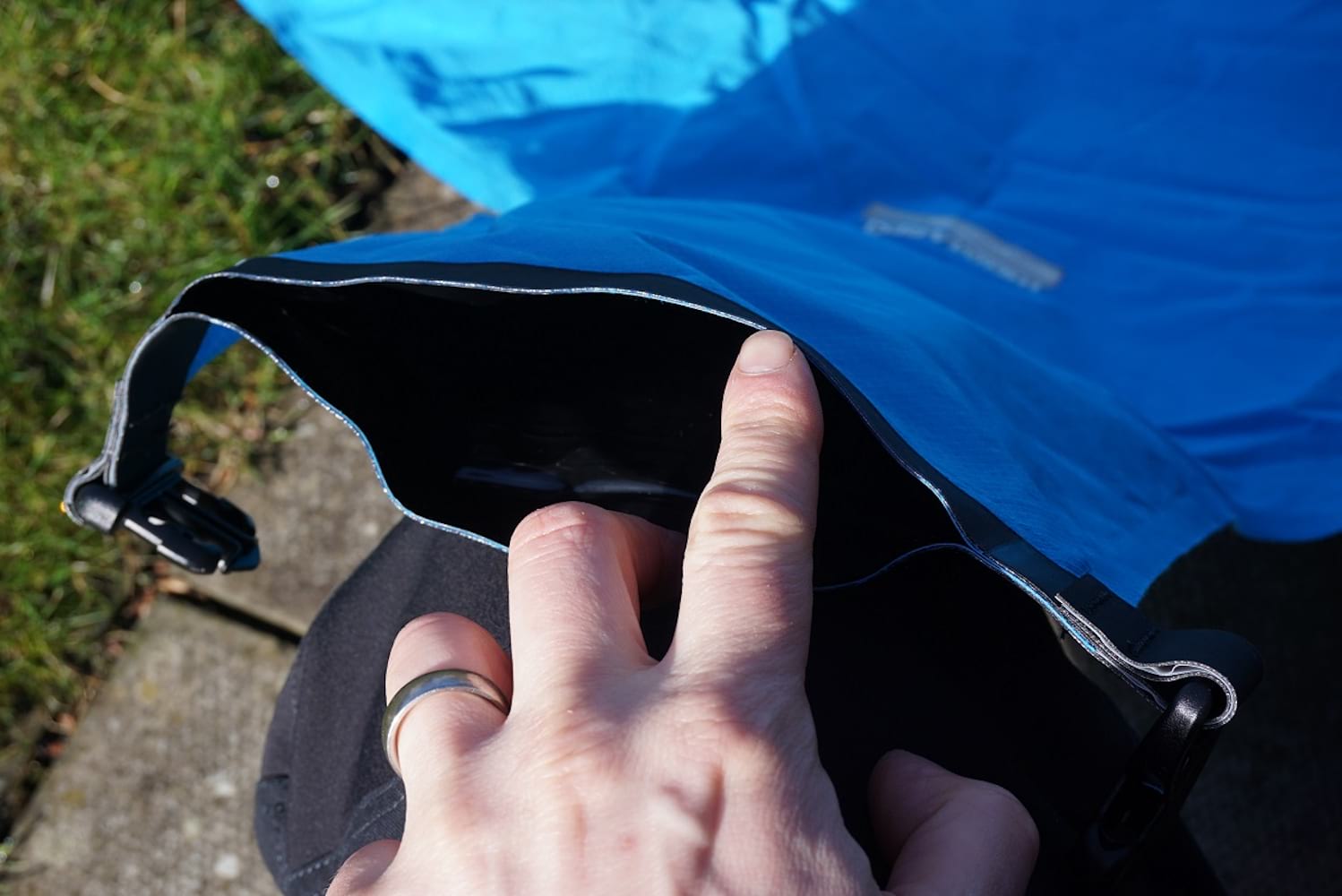 Within this, there is a black, open ended cuff that looks and feels like a heavy duty bin liner. By placing the cuff inside the bag and blowing into the opening from a few centimetres away, surrounding air is drawn into the bag. The cuff acts to prevent the air rushing back out when you close the dry bag opening over between puffs.