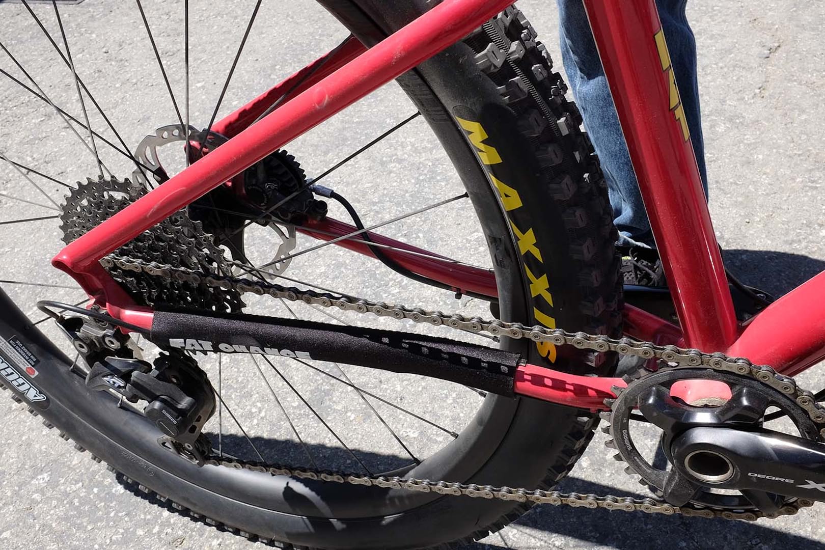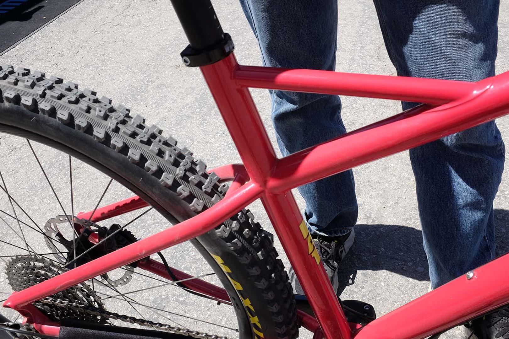 The bike here takes chunky 27.5in tyres, but there will be a 29in version with room for 27.5+ too. As you’d expect from a ‘modern’ geometry bike, the top tube is lower for better standover (while the headtube is a little taller than the Fat Chance Yo Eddy). Chainstays are a pretty short 425mm and the back end is 148mm Boost.