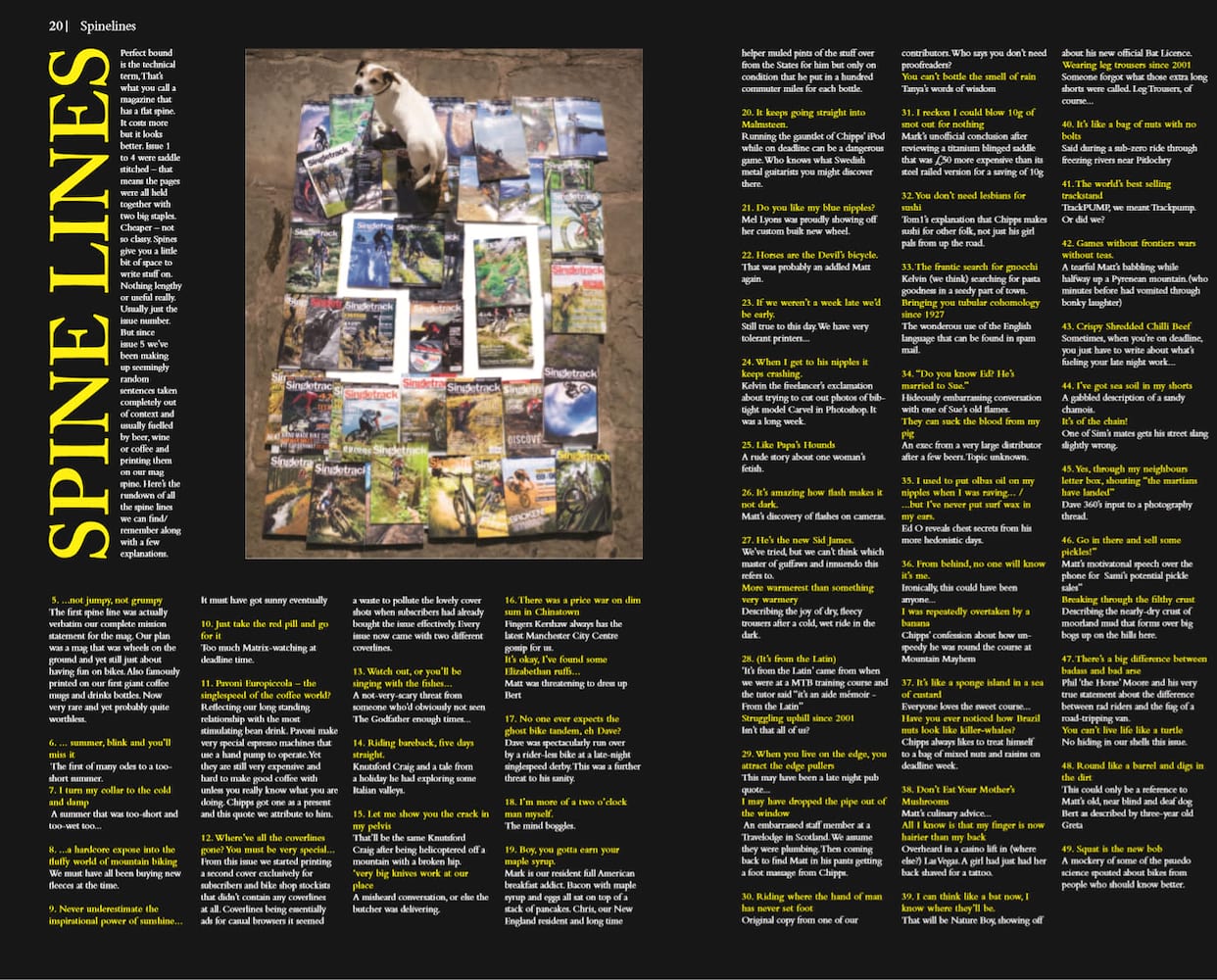Subscribers of Singletrack Magazine (Yes, there’s a magazine) will be familiar by now of the random and seemingly bizarre sentences that appear on the spine of every issue. They are given without explanation and certainly no context. They just exist to stimulate the imagination but mostly to amuse ourselves. They have become a bit of a Singletrack trademark over the years and we even published a story about them in issue 50.