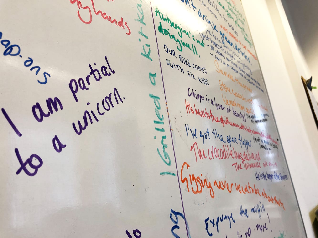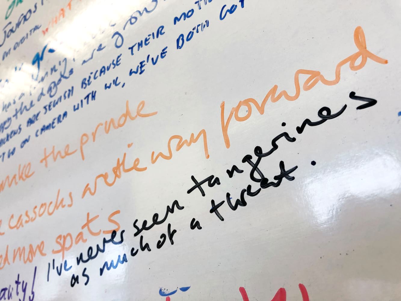 As you can see from our official spine-line board we are reaching peak spine-line. It’s an almost daily occurrence that someone will shout ‘Spine Line! Write that down‘. But the problem is we only print six issues a year and unless they get used they don’t get erased from the board. So we thought we’d introduce you to three random spine-lines each week. Of course they will be presented without context, and admittedly mostly for our own amusement, but we are going to invite you lot to guess the context in which each was uttered and we will pick the best explanations and send the lucky guessers some random prize or other.