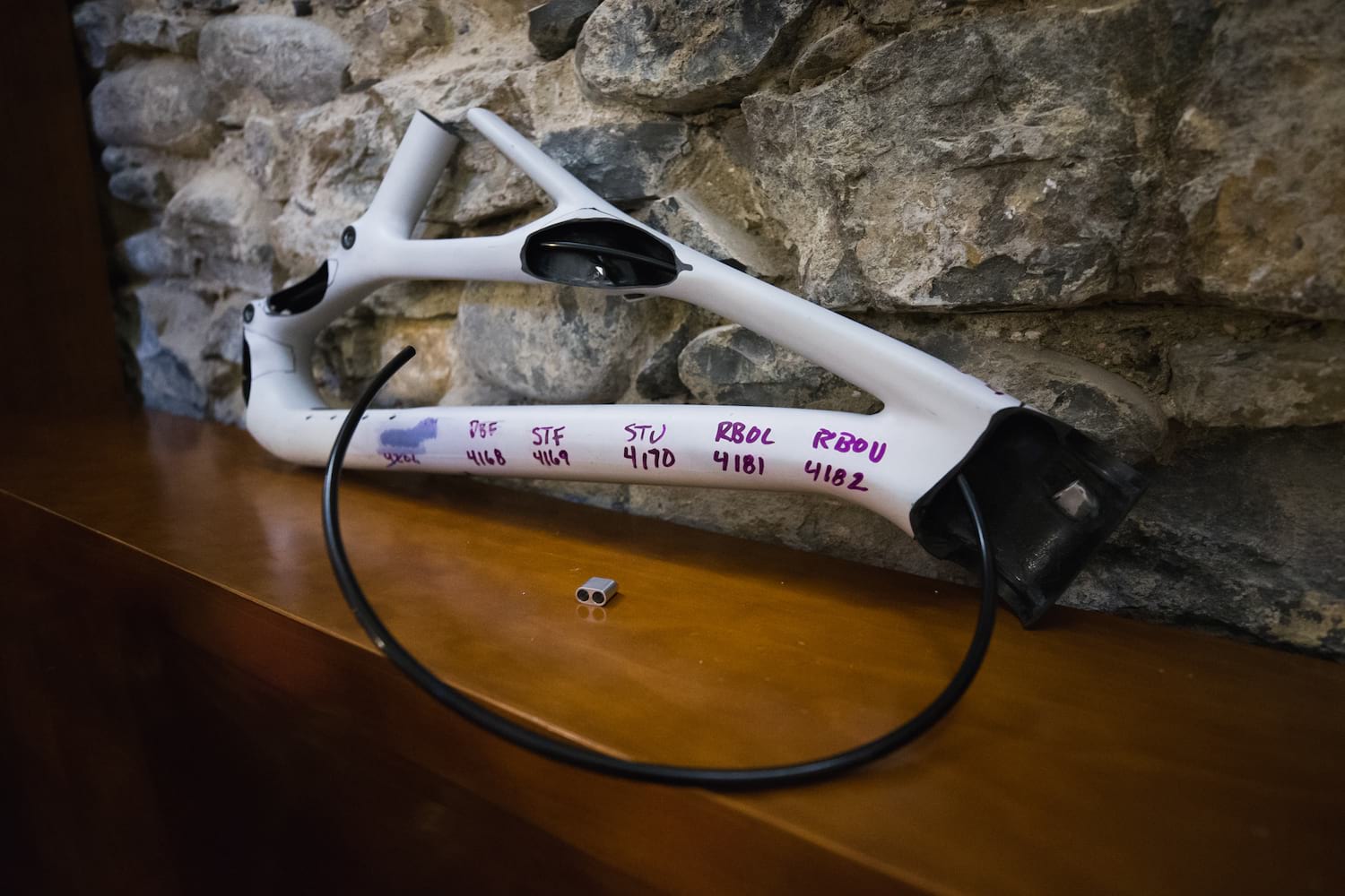 Inside the learning cave. The product presentation on the first morning was brief and devoid of specific details – the Specialized crew wanted us to ride the bikes with as few preconceptions as possible.3D printed models for the alloy Stumpjumper frame to check the internal cable network.Some people take weight reduction to the extremes! Or is that for aerodynamics…The old PF30 BB shell is on the left, and the new threaded BB is on the right.The SWAT door has been refined on the new Stumpy, and there’s now 20% more volume. A load of the Specialized designers and engineers who rode with us stuffed their lightweight rain jackets into the downtube. Others fitted theirs with bocadillos.The downtube is large in size, but uses very thin walls.Standard serious journo face for a detailed frame inspection.It’s a pretty haggard attempt at a kit grid, but then I seemed to be running late for everything on the Stumpy launch, so this was as neat and as considered as it got. Soz.Just a few bikes for to test.Checking suspension pressures and saddle height before the ride.Matty Hunter chatting with one of Specialized’s lead product managers, Colin, before setting off on the ride.The Stumpjumper Expert 29 was the bike I spent most time aboard during the launch. I quite liked it.“Got any sweet stickers mate?”The riding in Ainsa is absolutely magical. The trails are old, natural and rugged, but they flow with the contours of the mountainside to make them seriously quick to ride.Matty Hunter schooled us all with his effortless riding style. He is just as chilled off the bike too.It didn’t take me long to feel comfortable on the Stumpy 29er – it’s a terrifically well-balanced package from its 2.6in wide tyres up.Clearly the pace was a bit too hot for some.The Stumpjumper uses an asymmetric ‘Sidearm’ frame design that’s been inspired by the Demo downhill bike.Now you see it……now you don’t!We’d only set off up the climb for about 5 minutes before we ran into these friendly fellas. You can’t see the little fluffy one who’s standing behind old mate in this photo.He ended up following us on the trail for a good half an hour before we realised that he probably wasn’t going to turn back. Sean Estes, Specialized’s main marketing man, embarked on a rescue mission to take his cuddly friend back home, becoming the most desirable man on the planet in the process.Meanwhile, we continued on our upwards journey. A steady 1.5 hour climb took us to a peak elevation of 1,075m.The start of the trail goes right through the middle of those castle ruins in the background. I can’t remember the name of the trail, but I can tell you that it was absolutely insane.