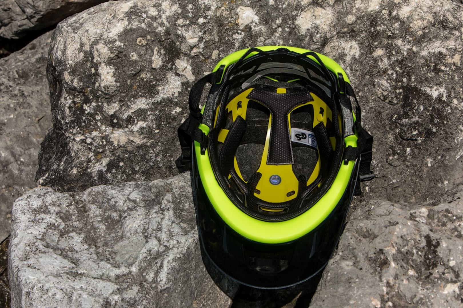 This is all mounted on a nylon-plastic skeleton. Not all helmets use a skeleton as they add weight to a helmet but there are big strength – and therefore protection – advantages of doing so. A skeleton also allows for a more secure anchoring point for straps and better integration of vents into the helmet design (all of Abus’ higher end MTB helmets feature a nylon skeleton). The helmet is fairly weighty though, on my kitchen scales the medium comes in at 444g (a fair bit more than the published 370g).