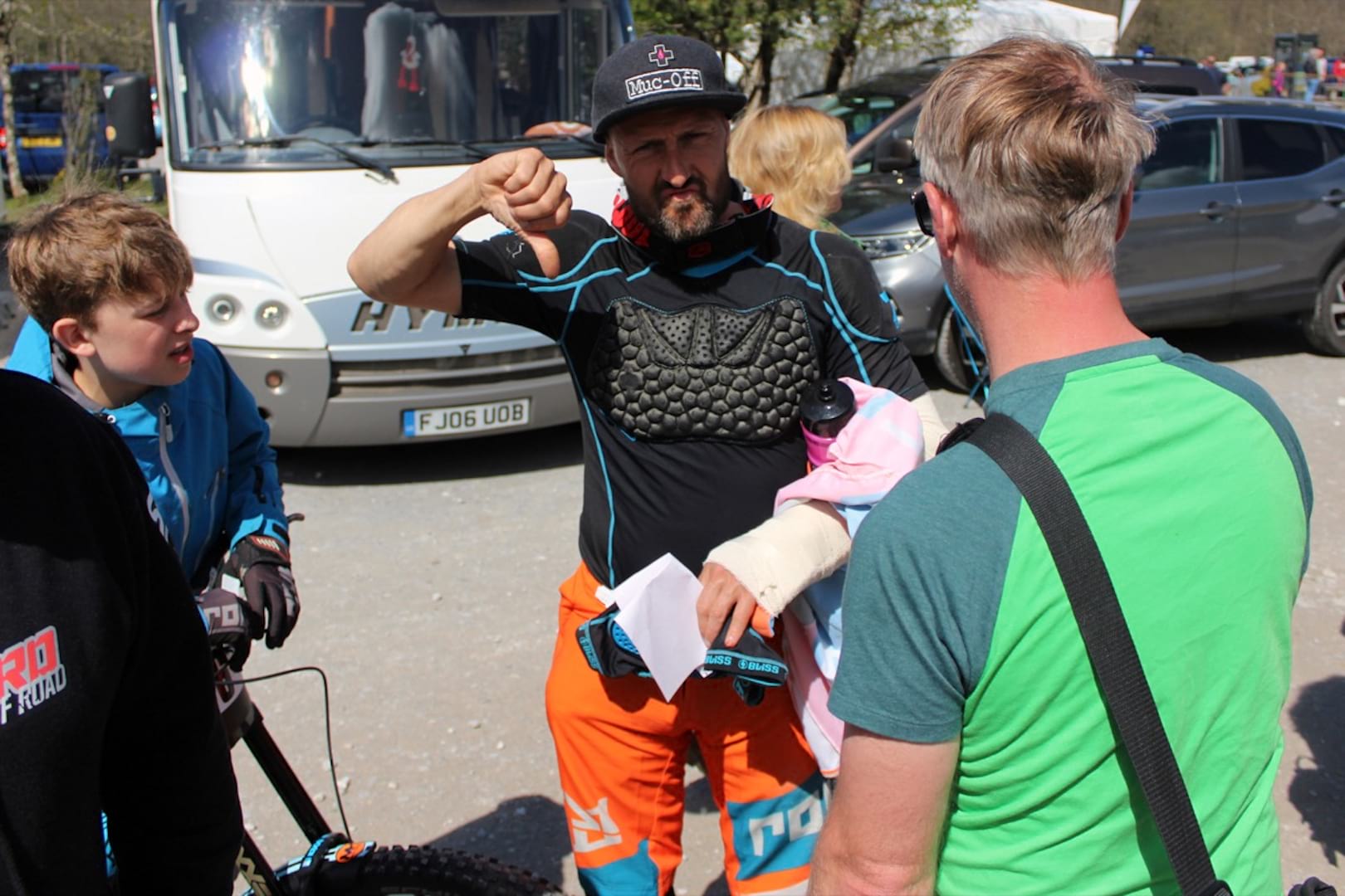 We’re back onsite early on Saturday (n.b. Binnsy had no trouble arriving early on Saturday morning) with the intention of being on the first gondola of the day. In a somewhat uncharacteristically unselfish act, Binnsy volunteers to help the Steve Peat Syndicate guys put their gazebo up, and in doing so puts his back out. I mean, you could definitely write the script. He’s already got his kit on though so he comes up in the gondola to try and ride but he can’t even sit down properly so he’s out. I don’t think he thought things could go any worse than last year but his weekend’s done – a 700-mile round trip without a single run to his name.