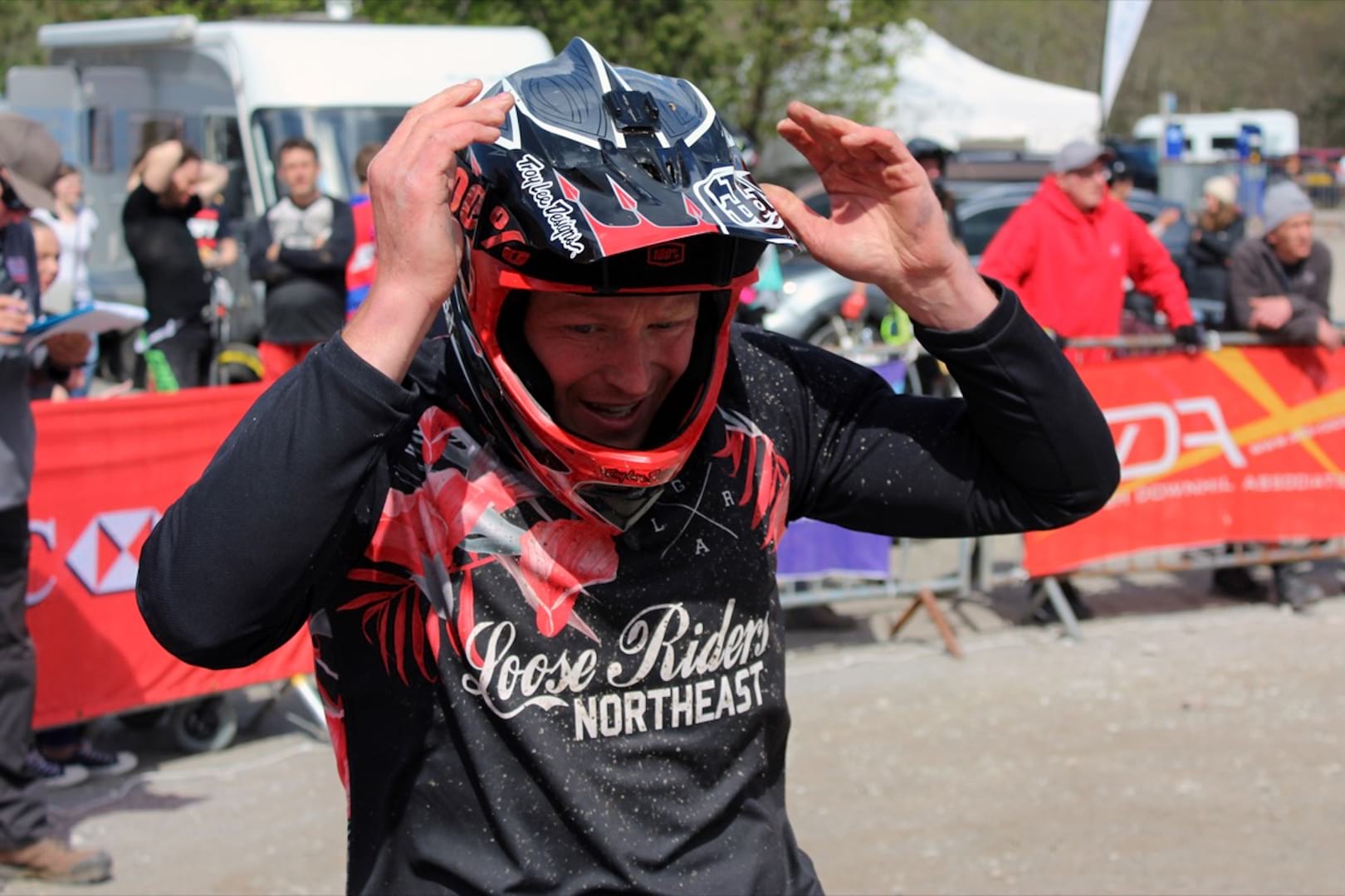 Although the top section is exactly the same as previous years, the third quarter of the track has changed completely since we were here for the BDS last year. There’s a huge new section after the Deer Gate that’s really fast and flowy. Then there’s a completely new bit in the woods, replacing the infamous bog section that blighted riders at last year’s World Cup. It’s tight and twisty and super slow, almost a bit “trialsy” I suppose. On the track walk I thought it looked quite straightforward but first run in and I’m over the bars, smashing the visor on a new helmet. A combination of tinted lens and according to Jason “age-related macular degeneration”. I’m not alone though. Binnsy spends a big chunk of time watching riders coming through this section and there are a lot of crashes. “It’s the best place to watch” he quips.