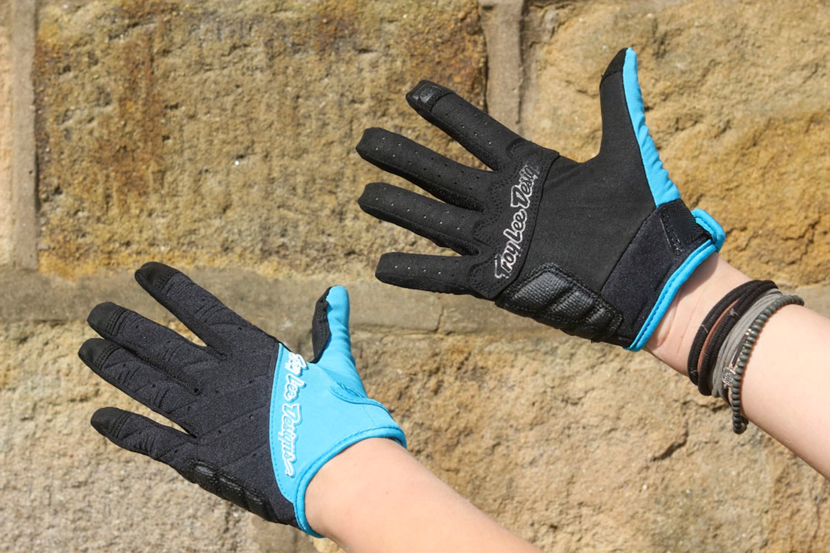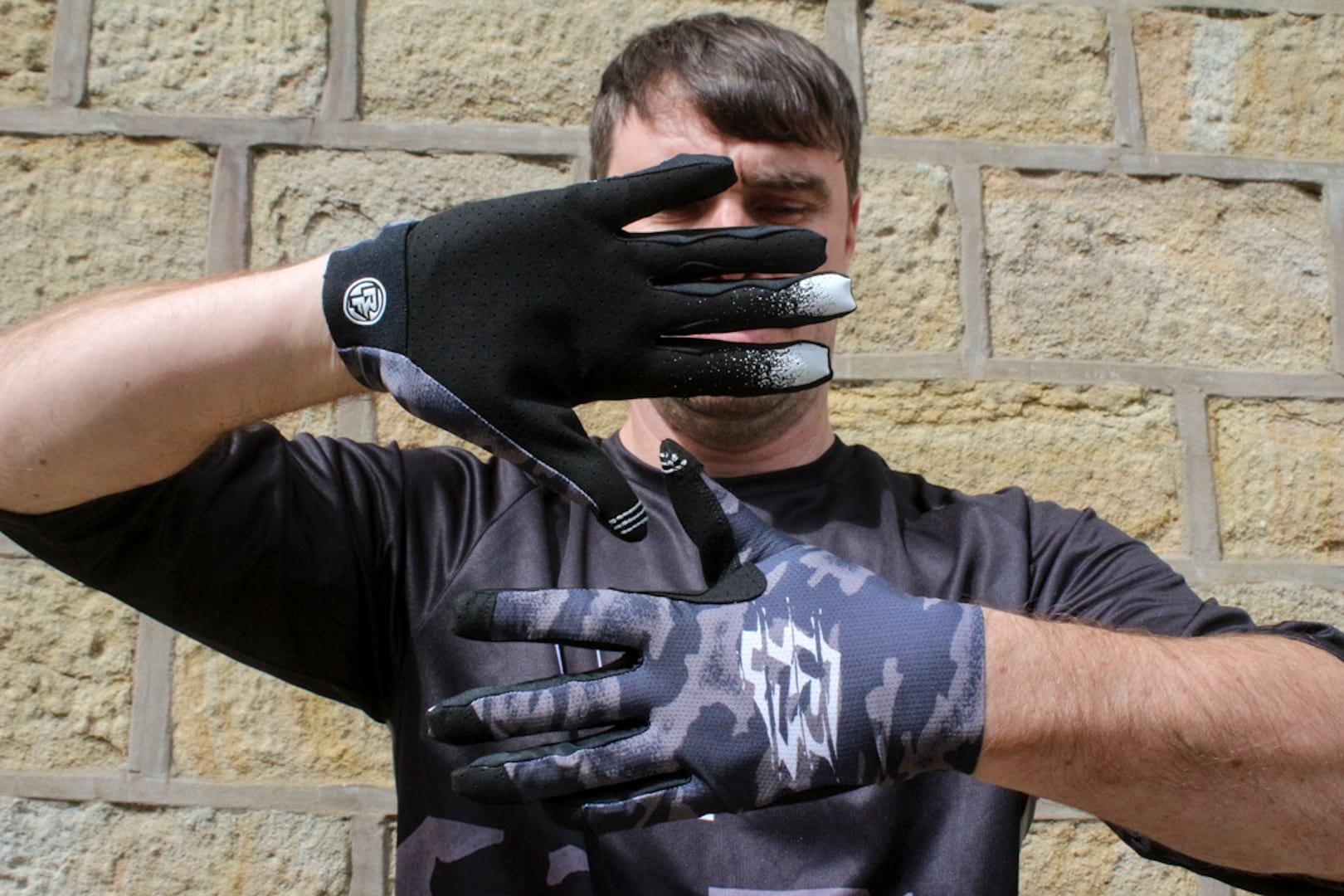In her best studio model style, Hannah is wearing a medium women’s Covert glove (the speckled one) and a men’s small Covert glove. Both are minimalist gloves with soft synthetic suede palms and mesh uppers. A spot of silicone on the fingertips keeps you in contact with your levers.