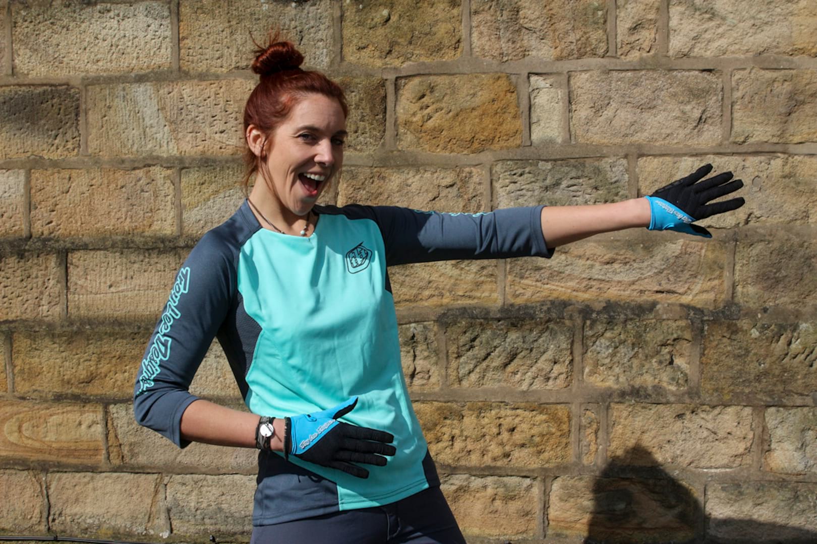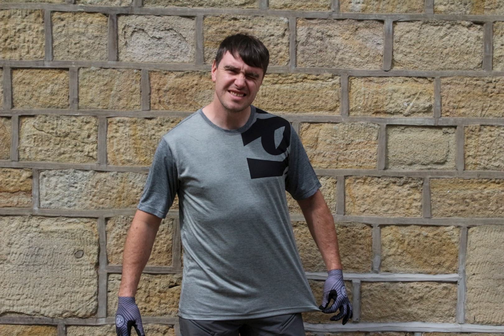 Ross is wearing a silky feeling ‘Cool Touch’ fabric jersey in a freeride cut. The mesh back panel should help him keep cool as he sweats his way up hills before free falling down them and breaking his ribs, again.