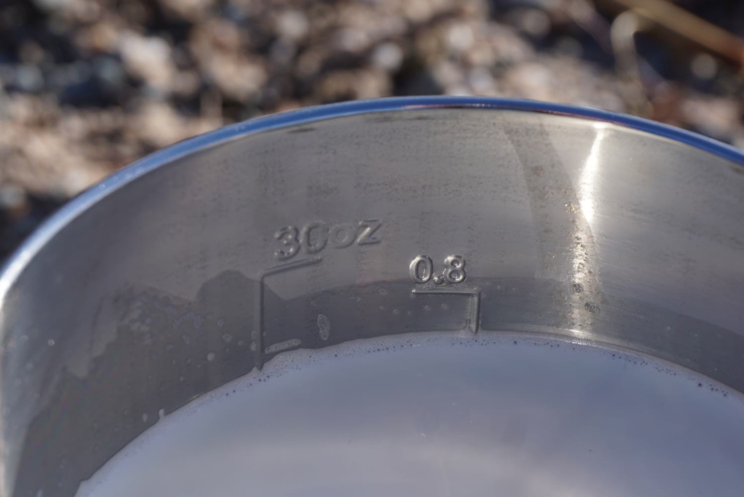 So far, so simple. Also supplied is a very neat cooking ring which sits flush within the burner when not in use but which when inverted, sits securely on the top of it. Again, this features built in air holes. Topping things off, both literally and figuratively, is a 900ml stainless steel pot. Volume markings in millilitres and fluid ounces are marked down the side while there are two fold flat wire handles t stop your fingers getting burnt when you pick up the pot.