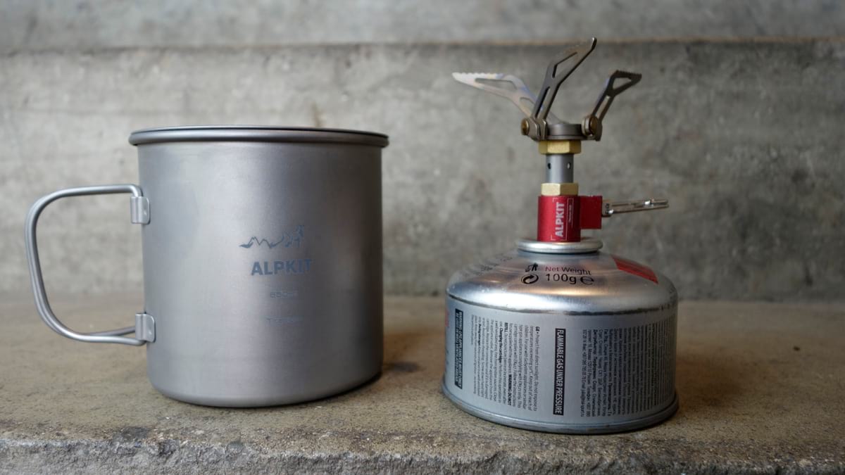 A teeny weeny stove and a mug just the right size for a can of soup – great for cooking up beans, noodles, or whatever else keeps Stu going through the HT550. The stove itself folds up small enough to fit in the palm of your hand, though obviously the gas canister takes up a little more room. The titanium mug comes with a lid, so you can use it for cooking from as well as drinking and eating out of.