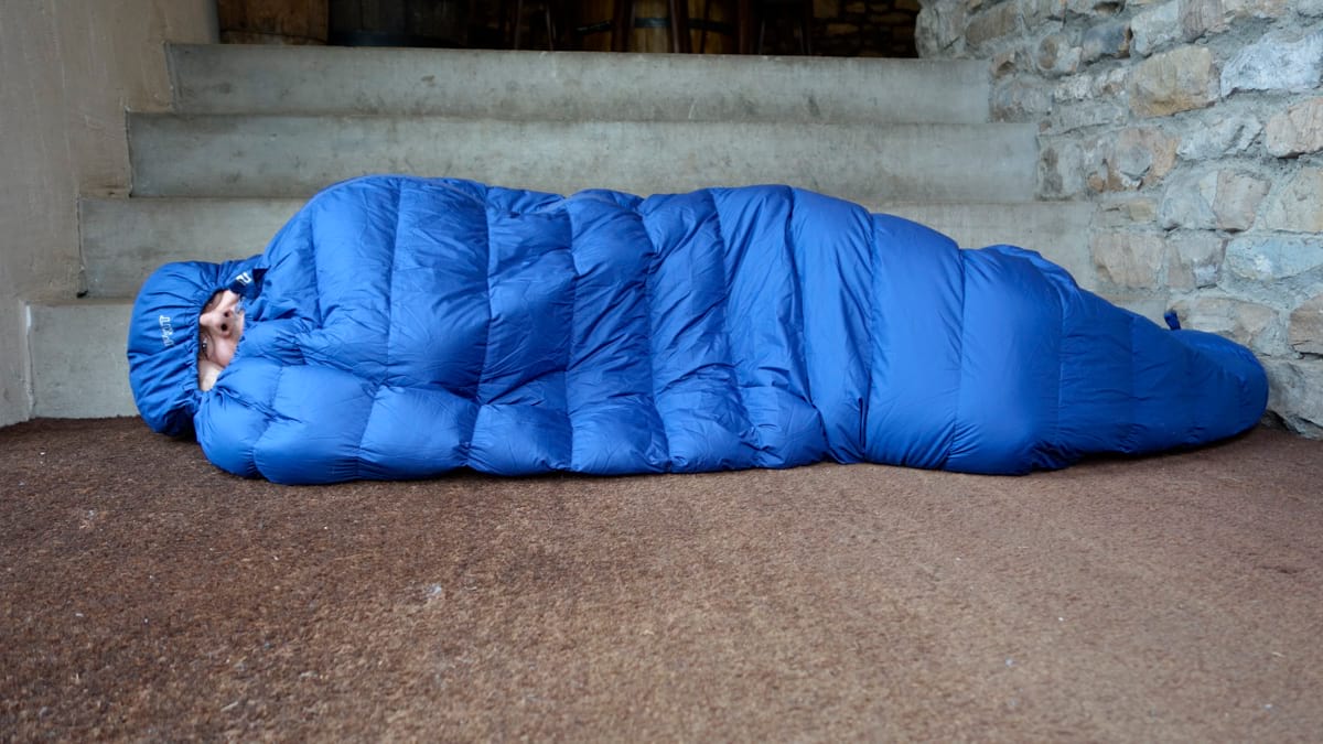 This is a proper piece of kit for a good night’s sleep. Ultra light, hyrophobic goose down filled and a DWR coating, with a 7°C limit (there’s a 400 and 600 if you’re going somewhere colder). Stu looks rather cosy, though he says he’s not planning on doing much sleeping – just racing.