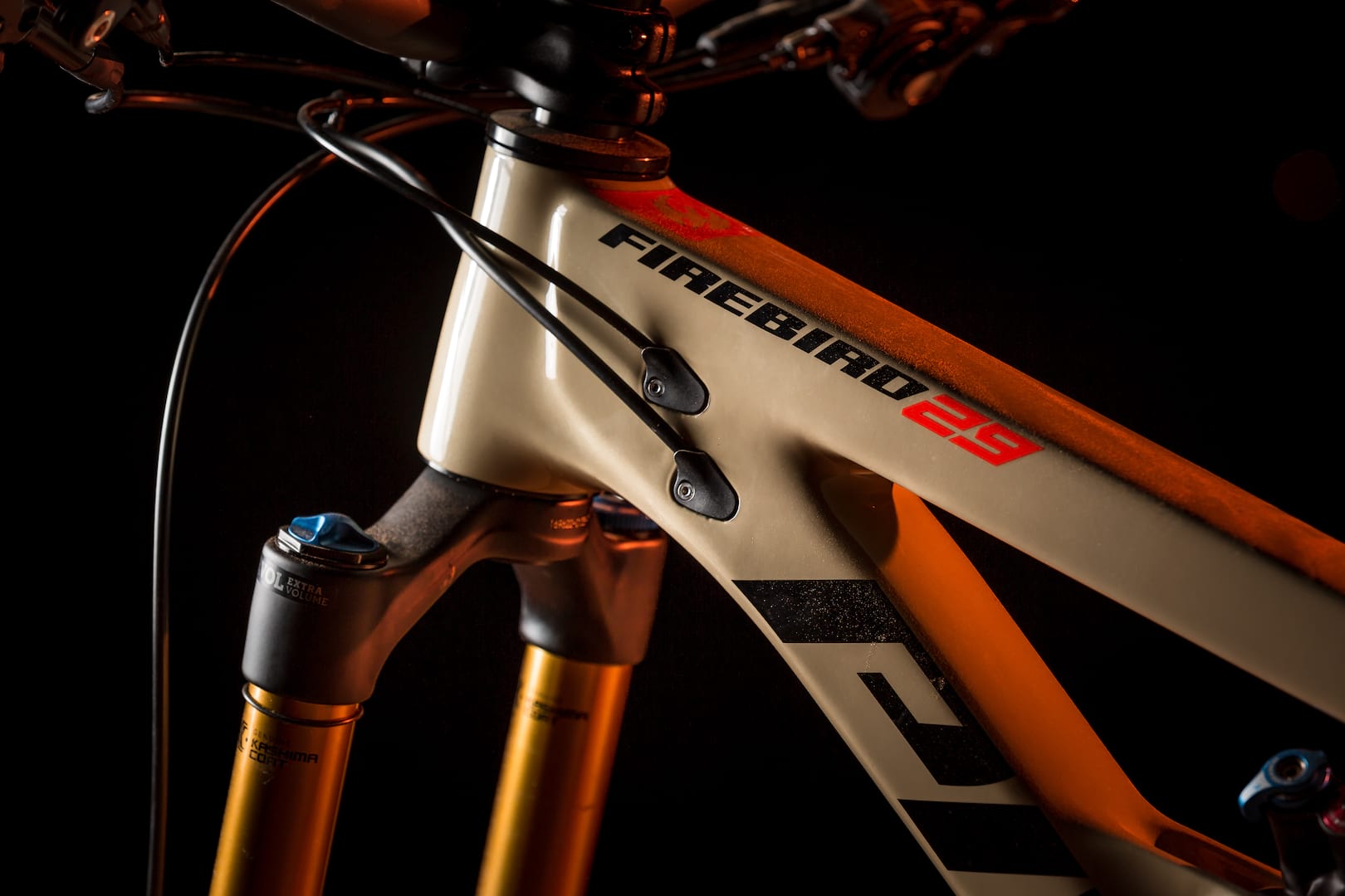 With its huge Fox 36 fork, piggyback shock and 2.5in Wide Trail tyres, the Firebird 29 has got a real monster truck vibe about it. The low-slung frame is made from carbon fibre (there are no plans for alloy frames at this point in time) with an enormous downtube and a stout-looking double wishbone swingarm. There’s a straight 1.5in headtube that’s Angleset compatible, and the frame is even rated for use with a dual crown downhill fork. Yikes!