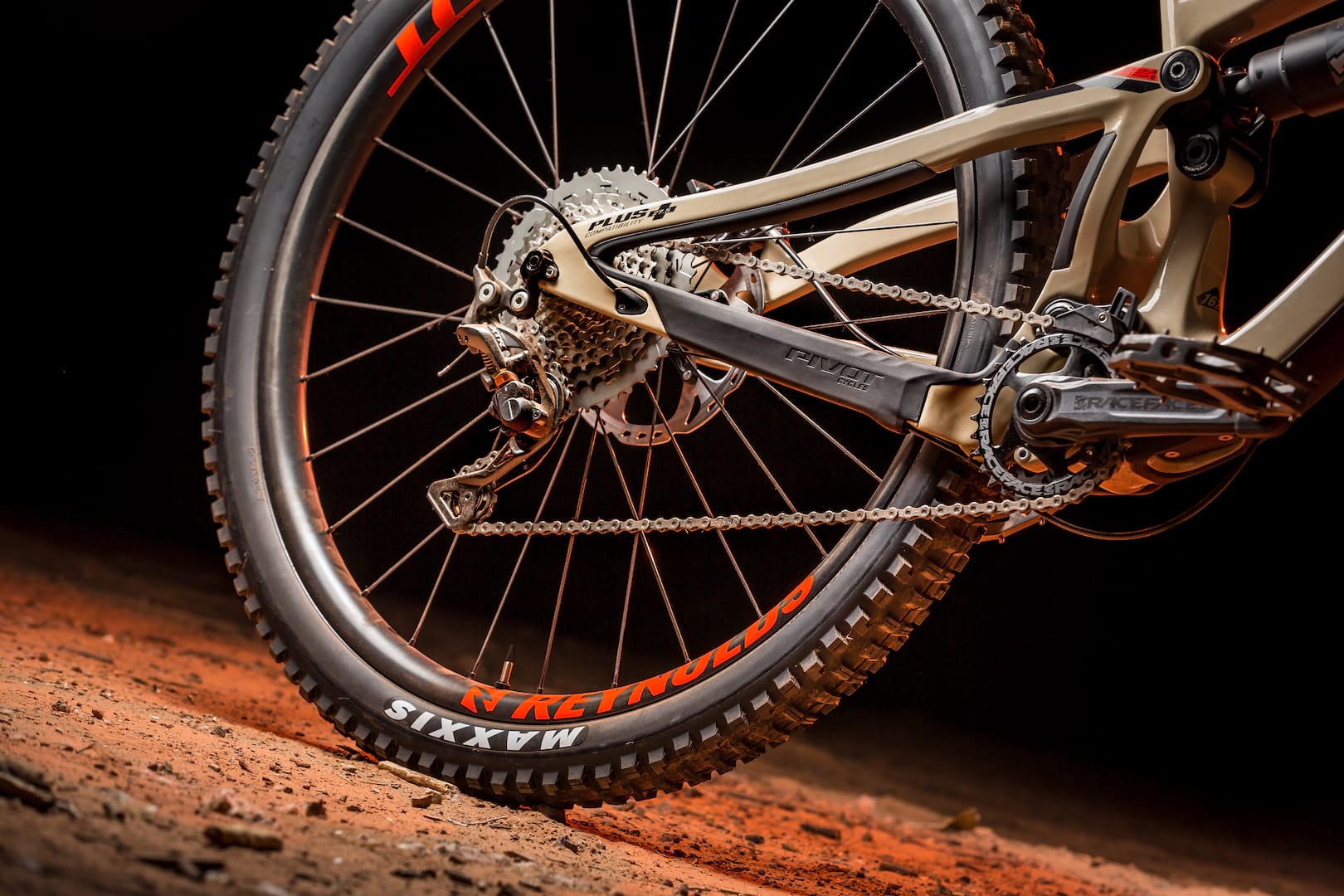 In order to achieve such a short back end while producing 162mm of travel with clearance for 2.8in tyres, Pivot has elected to run a 157x12mm rear hub. Referred to as ‘Super Boost Plus’ spacing (tongue firmly in cheek), this rear hub width is the same as what you’ll find on a regular downhill bike. The only difference is that the hub flange is pushed out a bit wider on the disc-side, in order to increase spoke triangulation to produce a stiffer wheel. Functionally there’s no other difference with regular 157x12mm rear hubs – the disc rotor and cassette sit in exactly the same position.