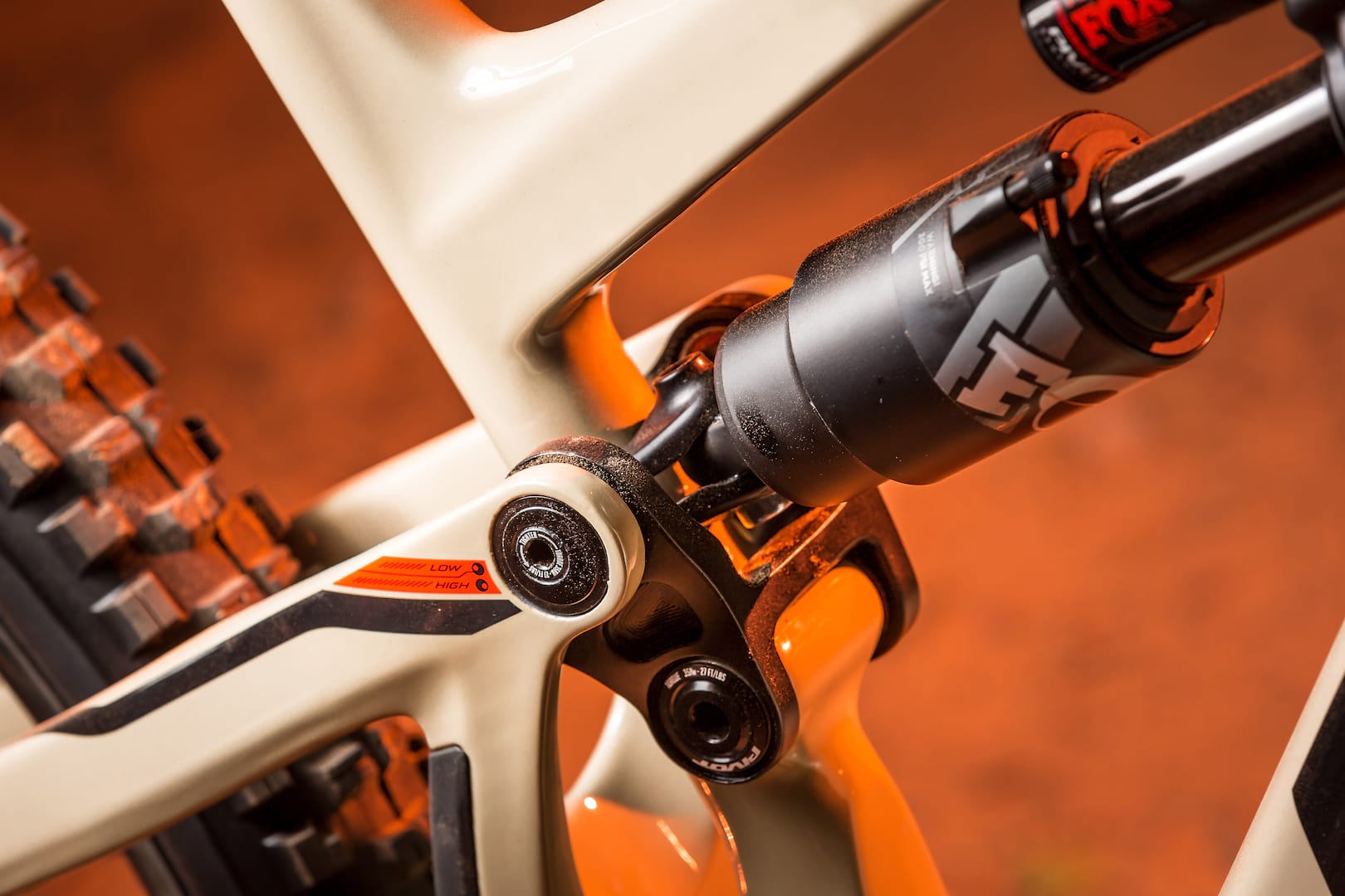Key numbers include a 65° head angle, a 74.5° seat angle, and a bottom bracket height of 341mm. These can be steepened by way of an adjustable eccentric pivot at the top of the seatstay and rocker link junction. Or they can be slackened by using a 17mm lower headset cup that extends the effective fork length. Either way, there’s a good deal of adjustment available for fine-tuning the geometry and the riding position whether you’re running 29in or 27.5+ wheels.
