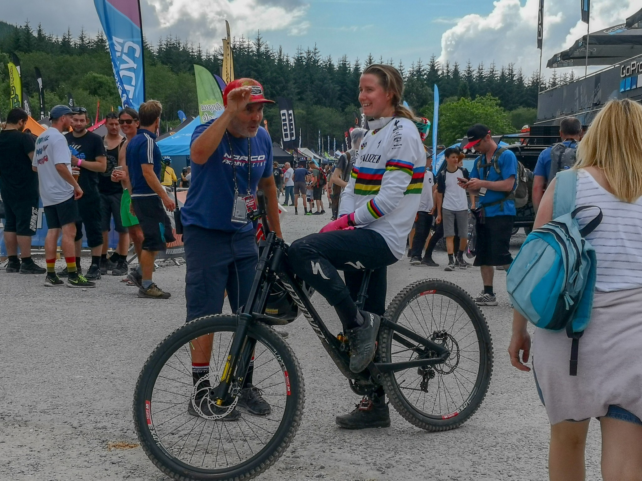 After a qualifying run which sees her start in 14th place tomorrow, Miranda Miller didn’t ride back to the Specialized pits to hide her super secret bike, but stood with friends to have a good yarn. And thankfully we had a mobile phone handy to snap these additional pics.