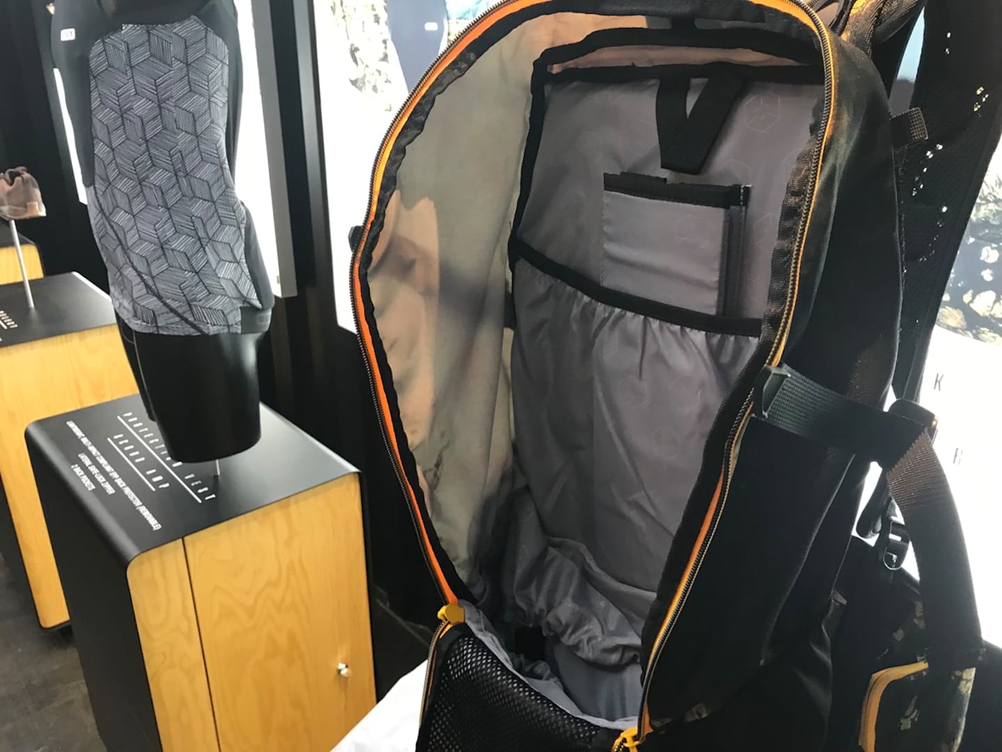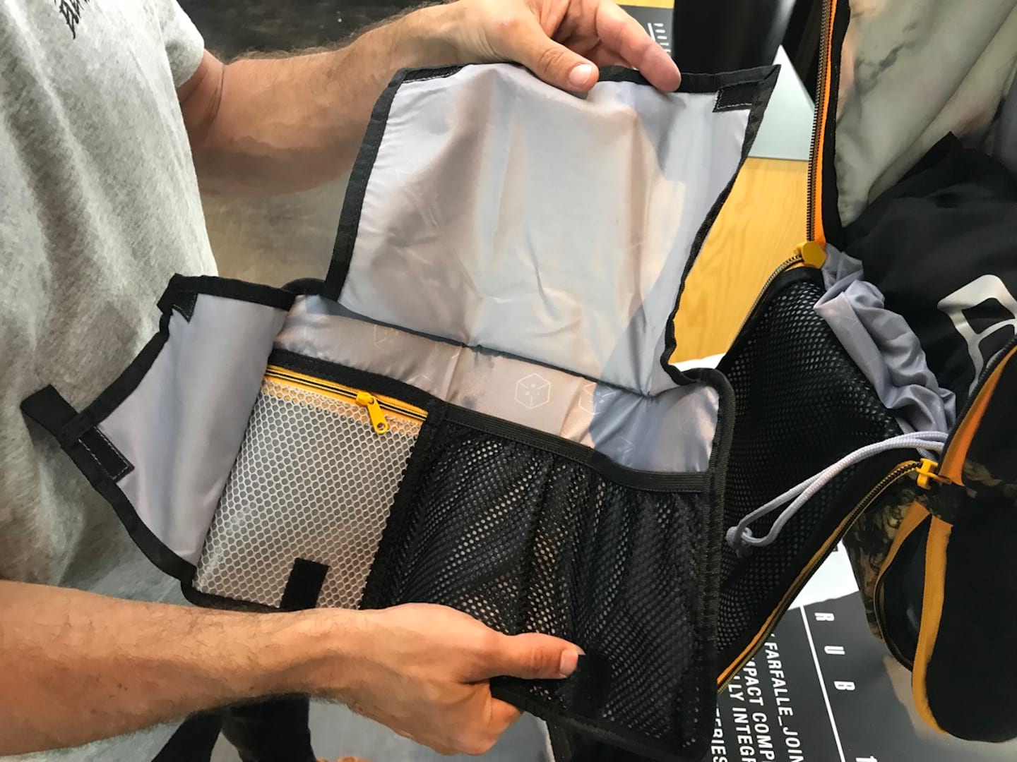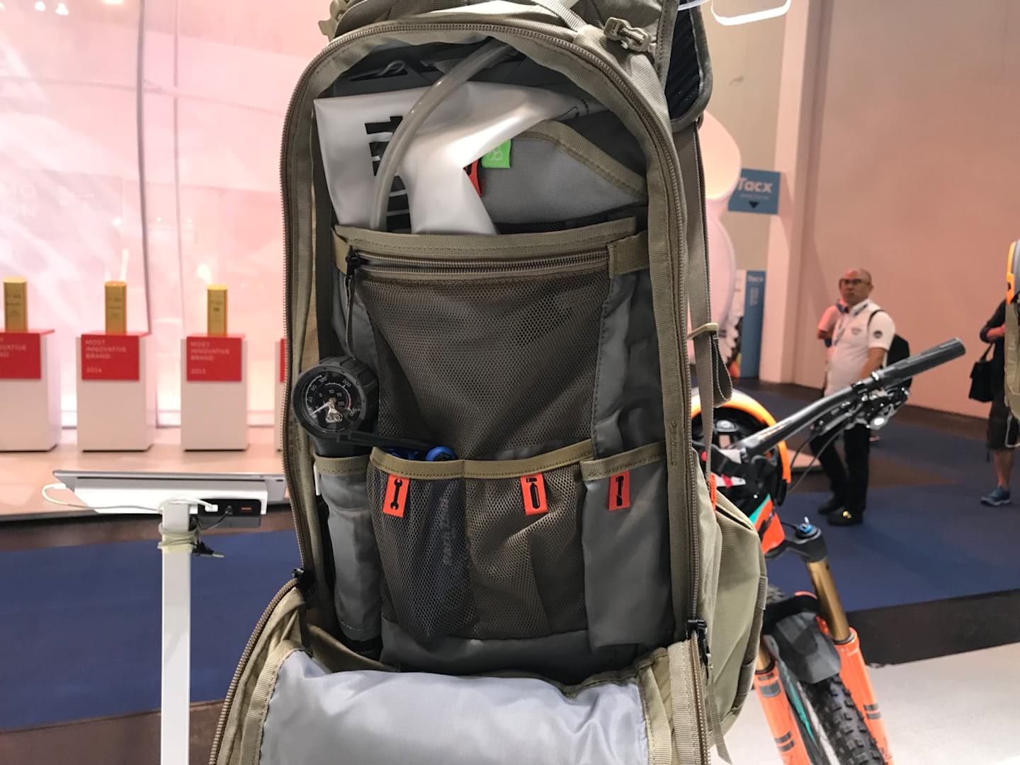 This is a new size of pack with back protector, designed either for big mountain riding, or e-bike riding – there’s a battery pouch inside. It’s truly a huge bag, you’d probably want to be on an e-bike if you were having to lug something this big around with you.