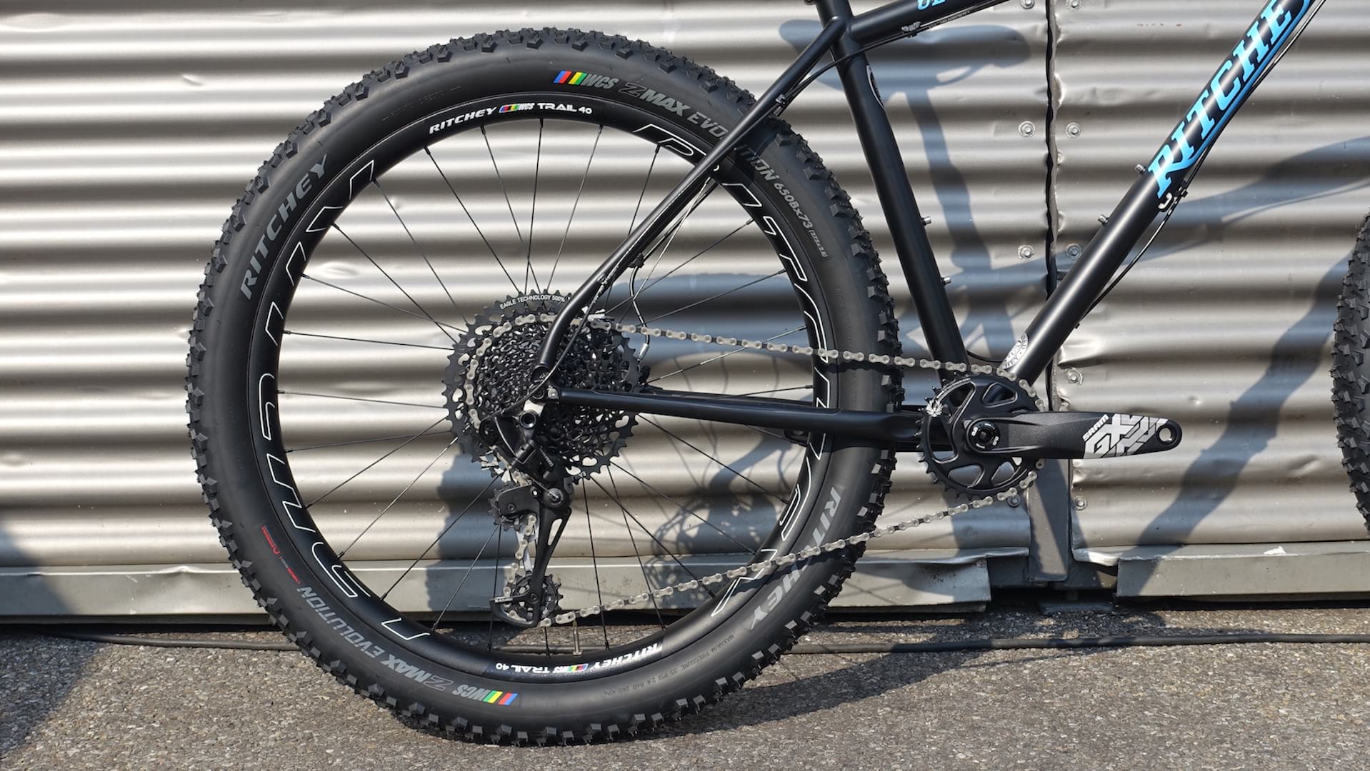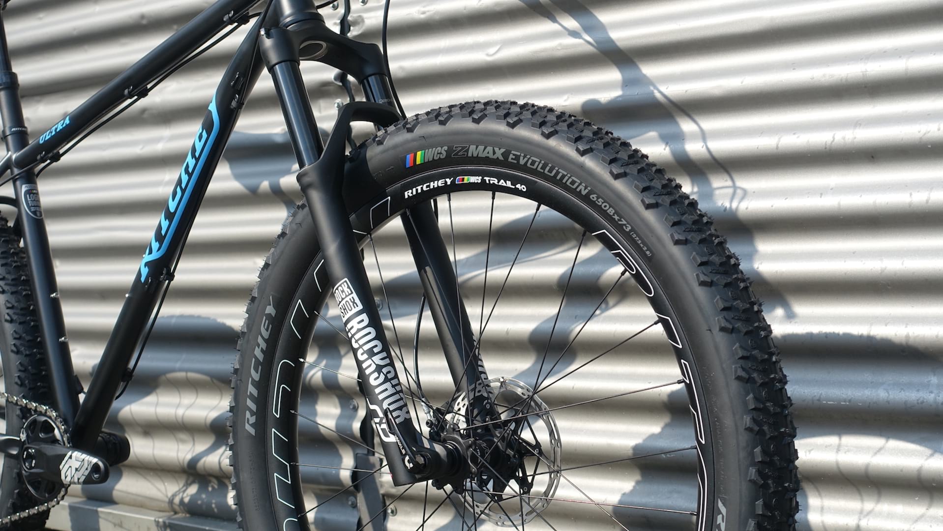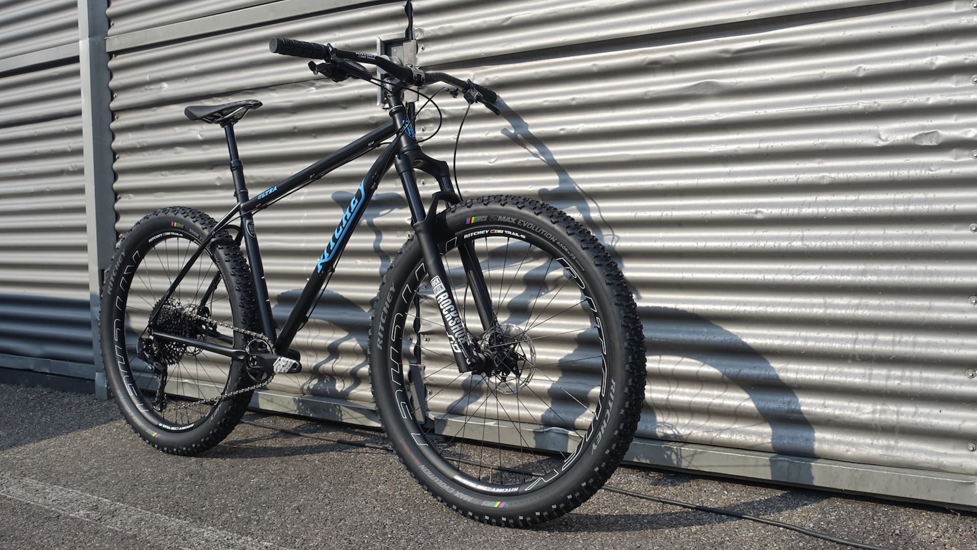 Up front is a 120mm travel fork, though no word on whether the frame is capable of taking anything longer. As for wheelsize, the Ultra isn’t picky – you can fit 29in wheels with up to a 2.4in wide tyre, or (like the show bike) you can run 27.5+ wheels and tyres. There’s room for 3.0in rubber, though the show bike had Ritchey’s own 2.8in wide Z-Max Evolution tyres, which were wrapped around WCS Trail 40 wheels.