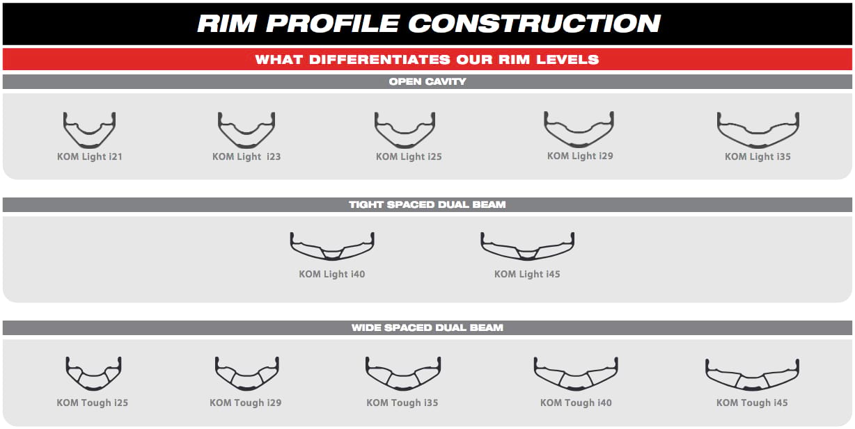The rims themselves are now split into two categories – KOM Light, and KOM Tough. With a lighter, open cavity construction, the KOM Light rims are narrower and are designed for gravel, cyclocross, XC and trail riding. The KOM Tough rims are wider with a dual beam construction and are designed for the burlier end of the riding spectrum – think trail, enduro and gravity disciplines. The other difference is that KOM Tough are 27.5in and 29in only, whereas KOM Light rims are available in a 26in size as well.