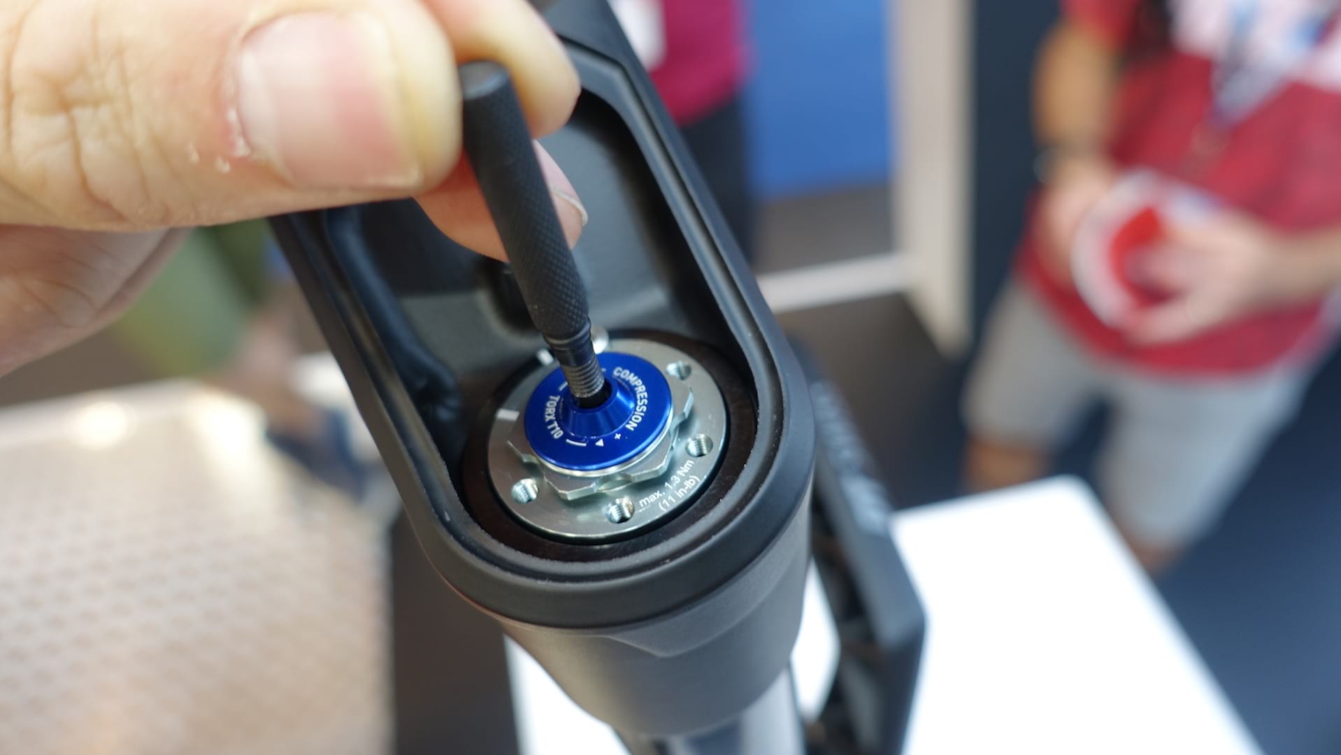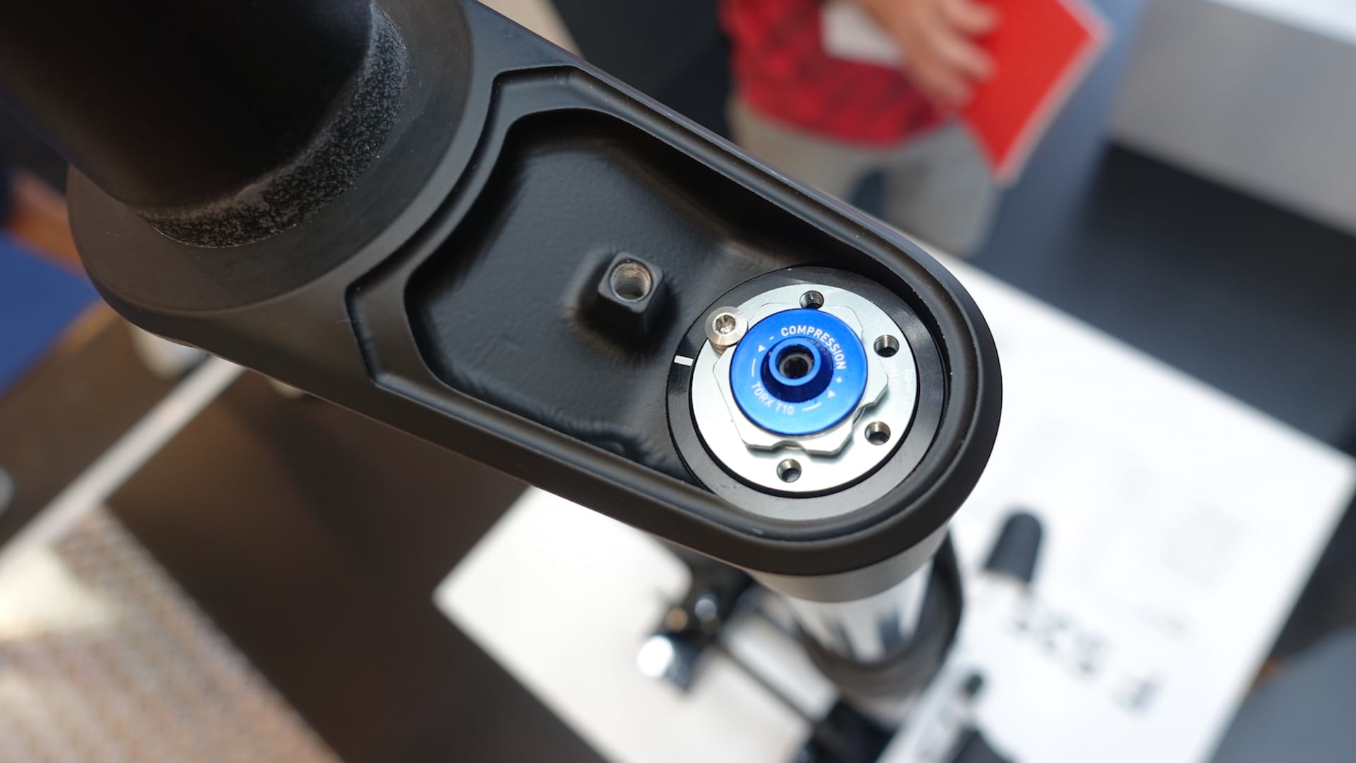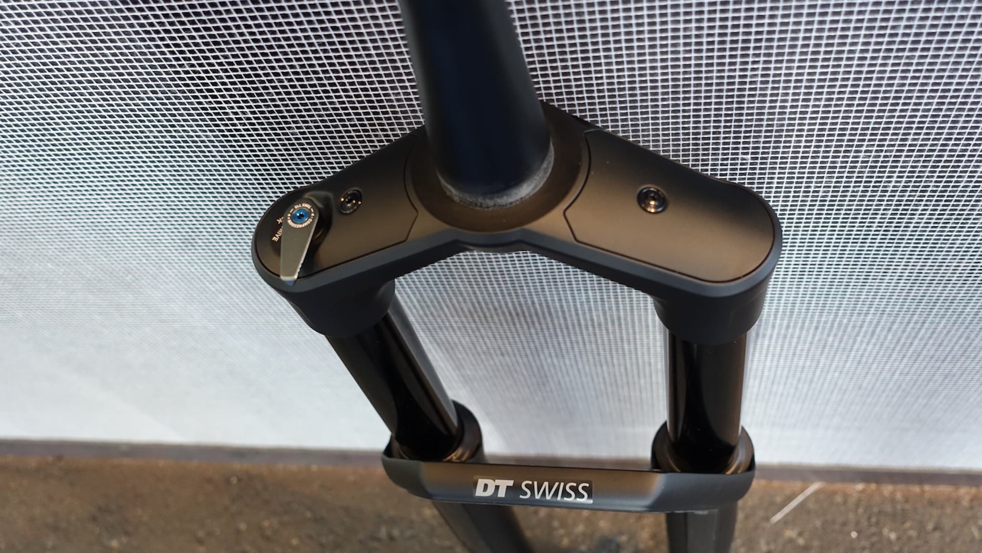 DT says the F 535 One takes a bit of getting used to, because it is so plush in the early part of the travel. However, the rider can increase the compression damping of the fork by way of a small blue dial at the top of the fork crown. There are 10 clicks available with this adjustment, and each click manually closes the Plushport valve. At the maximum setting, the Plushport is entirely closed, meaning you’re only using the fork’s high-speed compression shim stack for the entirety of the travel. However, you’d have to want a pretty stiff fork to use that setting – DT reckons most users will leave the compression adjustment wide open.