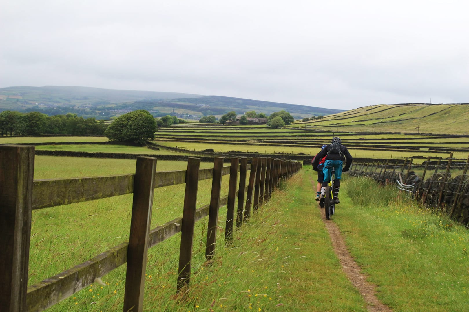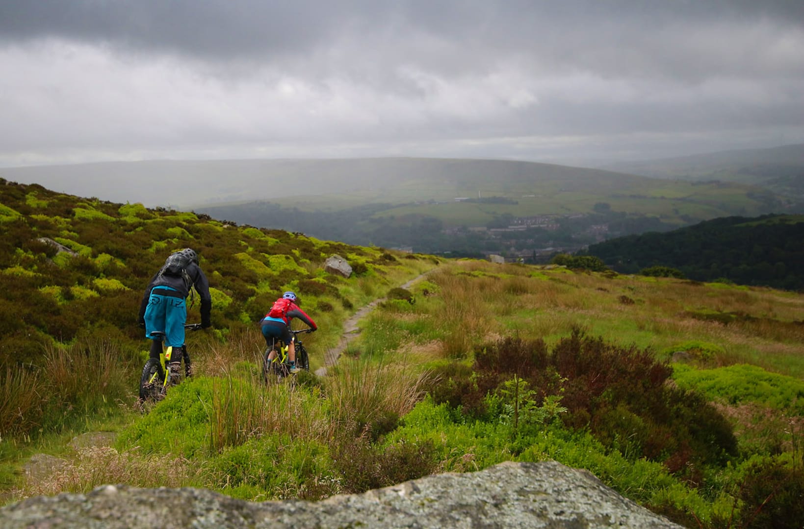 Revitalised by sun, sugar and saturated fat, we whooped wildly down a rocky trail, dappled shade blinding us to its obstacles until gulp inducing last moments. Another range check, a push of a button and a check of the odometer. Just shy of 50km done – we really wanted to break that barrier, and we looked to be in good shape for it. Onwards then, up a climb where height is gained quite startlingly, offering up a classic view over Hebden Bridge, before trees obscure the view and give way to a strip of farmland before hitting the moors.