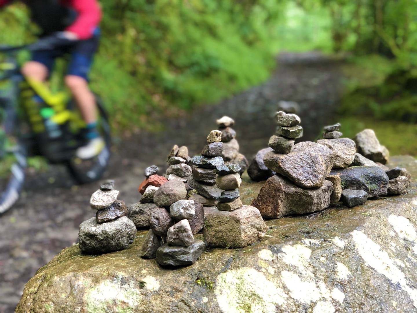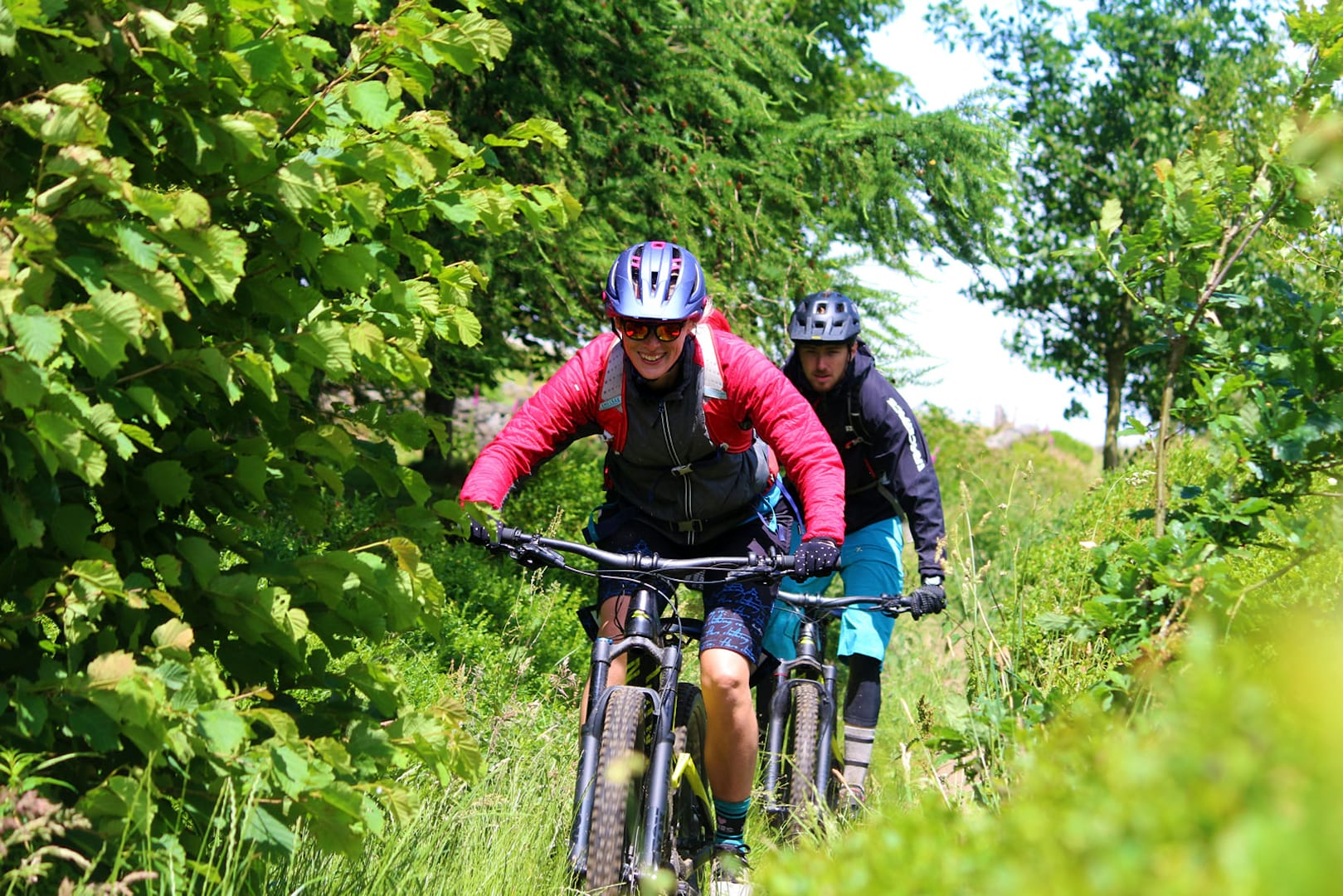 Mark and I were also discovering that e-bikes are not necessarily a leveller, if the fitter and more talented rider is also on an e-bike. Jack was managing to power ahead of us, apparently without effort, on every climb – occasionally while wheelie-ing – while Mark and I struggled to keep chins on bars and tyres on the trail over slippery rocks and tricky step-ups, despite occasionally risking a spot of battery life on ‘trail’ mode. An e-bike might make you feel like a fitter rider, but it won’t make you a better one. ‘We’re down to four bars!’ squawked Mark and I at the same time. ‘I’ve still got full power’ said Jack. Mark and I exchanged grunts.