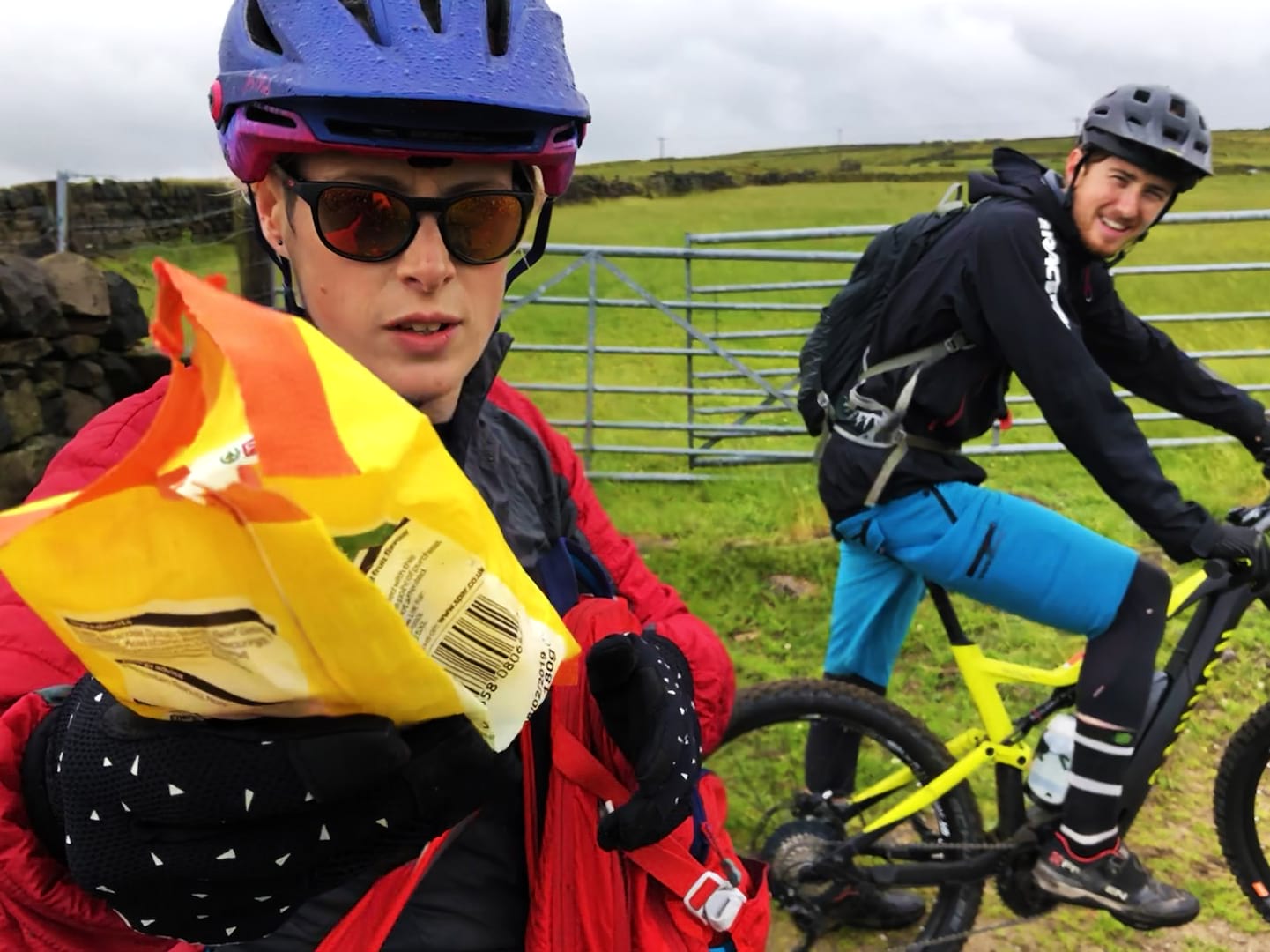 Reaching the top, the wind and rain stepped things up a notch. We put jackets back on, and swooped off down the classic packhorse descent in the direction of what looked to be sunny breaks in the cloud. Indeed, we briefly rode through that sunny patch, and then straight up the other side of the valley and into more, heavier rain. Photographic opportunities thwarted, on we pedalled. And stopped for a gate. And pedalled. And stopped for a gate. Mutterings started, some jelly babies were deployed. E-bikes, with their greater weight, do make gates harder, especially when those gates are being caught by the wind and whipped out of reach just as you’re trying to waddle through the gate or balance your bike against a wall. More jelly babies. More gates. It was almost as if I’d tried to string together as many gates as possible. And it was still raining.