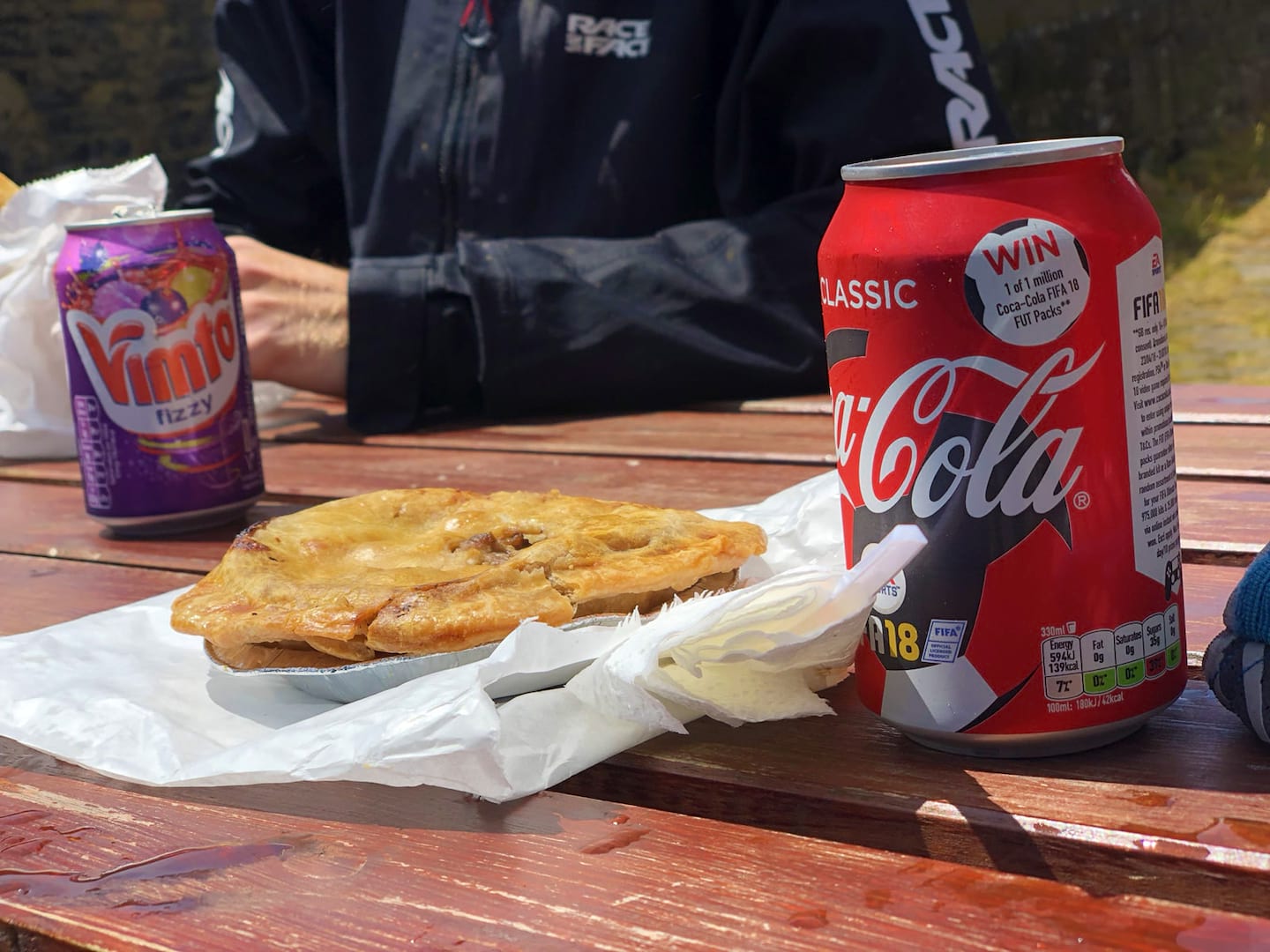 Thoughts firmly on pie, we pedalled with power off – quite an acceptable experience until you hit an incline – to May’s shop. This is something of a local legend, situated on the Pennine Way, and stocking a huge array of unlikely products. ‘Tractor and Machinery’ magazine in the rack, small batch Icelandic vodka and (my favourite) blood orange gin on the shelf, and a glorious array of pie, cake and obscure fizzy drinks in the fridge. Slightly overcome by choice, we staggered about looking at the many items on the shelves while our pies were warmed. With a ping of the microwave, piping hot pies were handed over, and we stepped outside to find that blue skies were appearing, and the sun was peeking through.