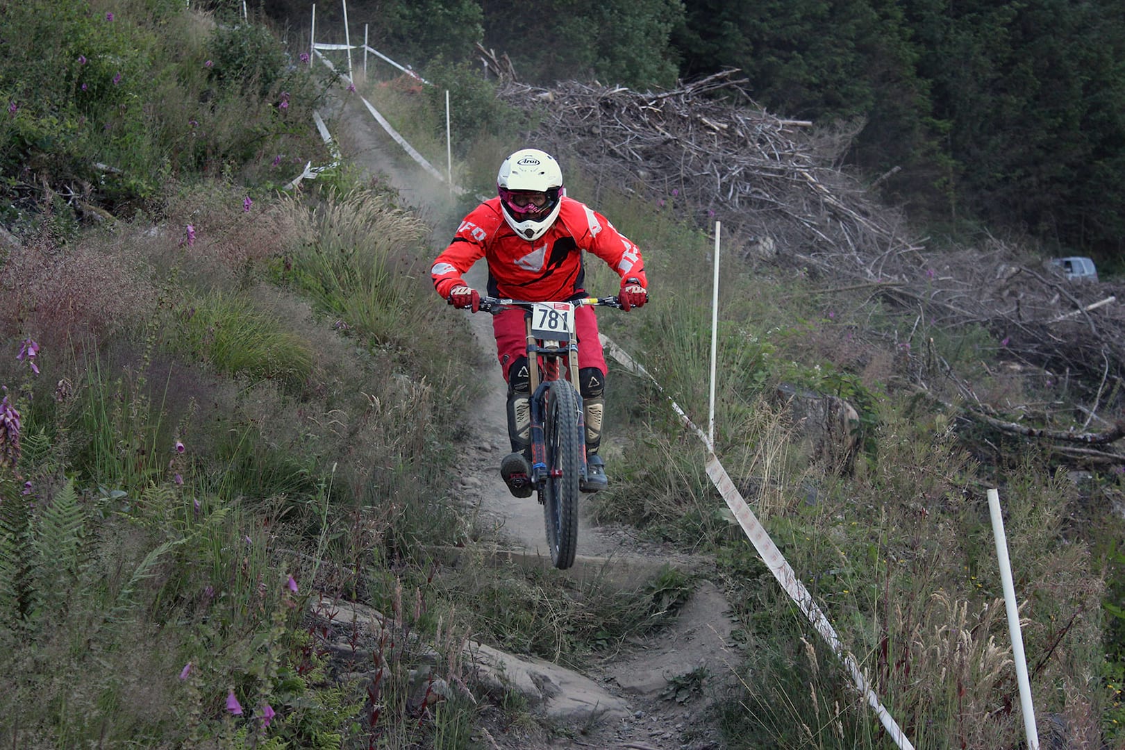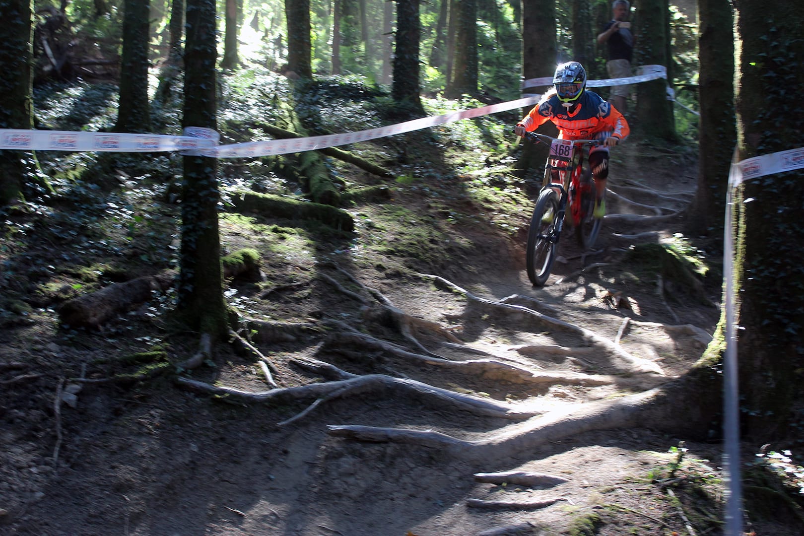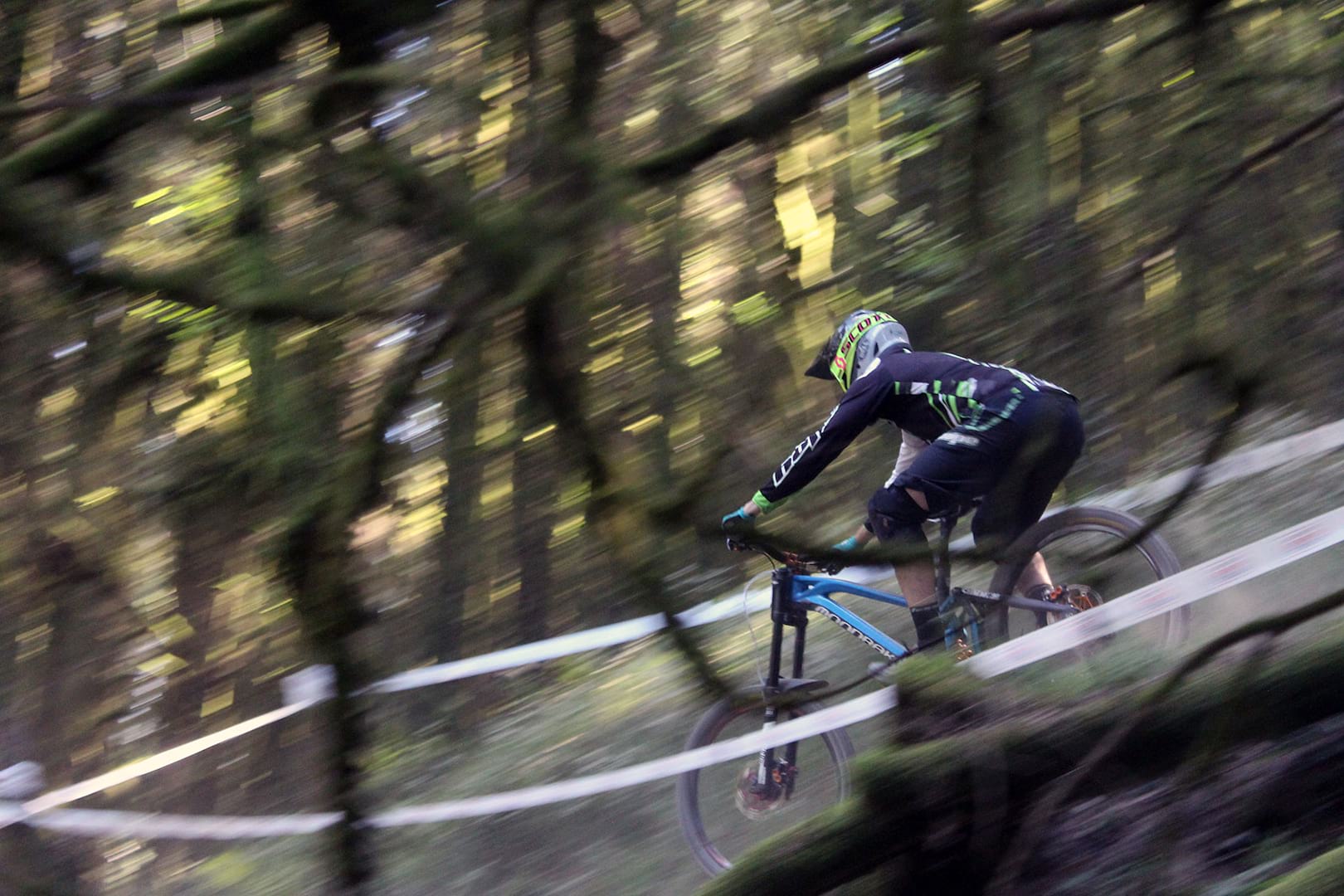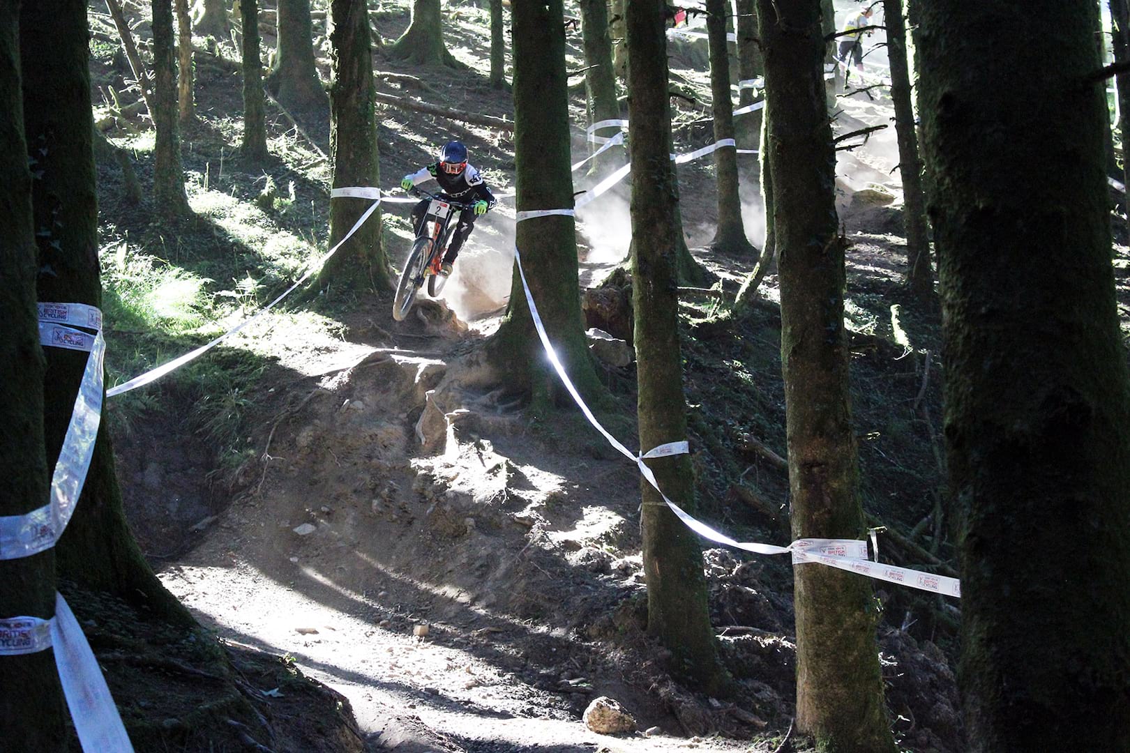 The track is quite similar to the one we raced at Bala just one week earlier. It starts with a wide, flat out bit down to the first fire road; then it gets tight through the tree stumps down to the next fire road; then it’s back into the trees before ending with a few jumps towards the finish line. Somewhere in those trees three-quarters of the way down is the infamous ‘Star Wars’ section which is hard work (read: absolutely treacherous) in the wet.