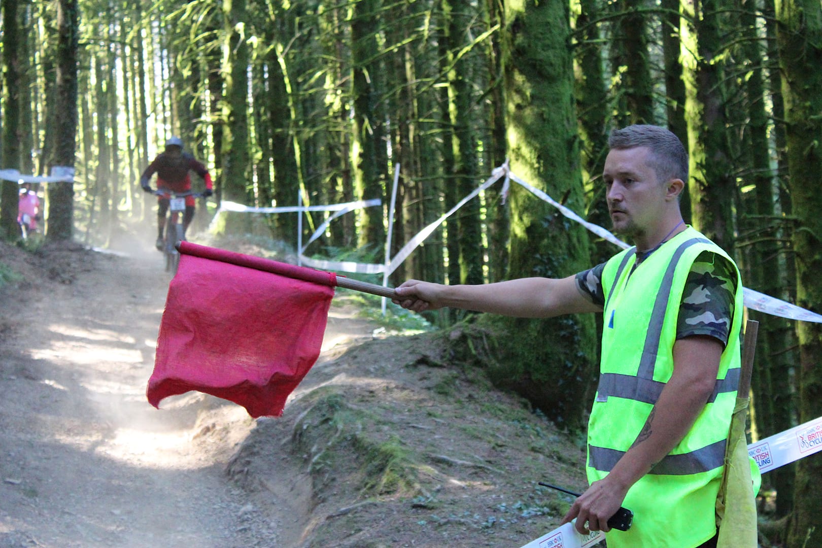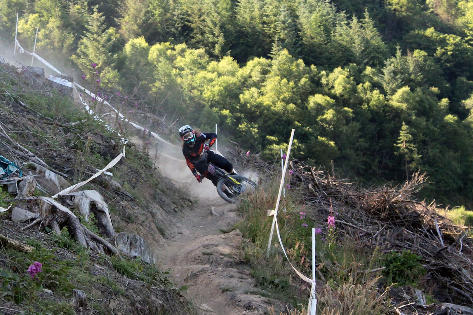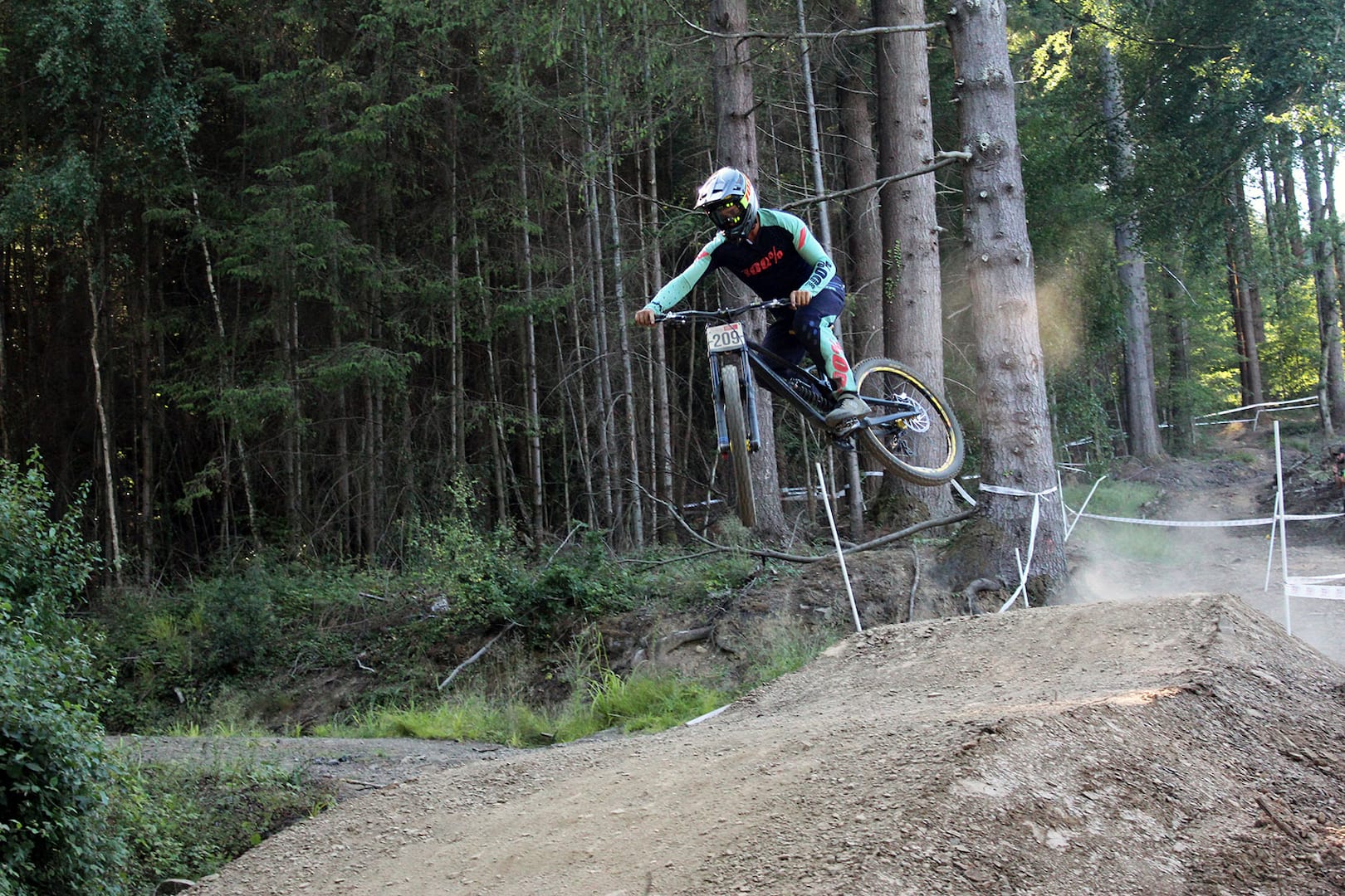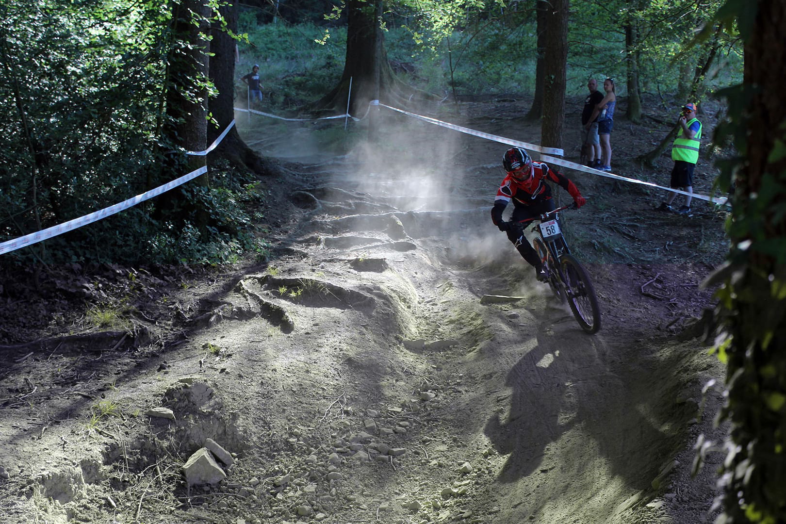 The track is quite similar to the one we raced at Bala just one week earlier. It starts with a wide, flat out bit down to the first fire road; then it gets tight through the tree stumps down to the next fire road; then it’s back into the trees before ending with a few jumps towards the finish line. Somewhere in those trees three-quarters of the way down is the infamous ‘Star Wars’ section which is hard work (read: absolutely treacherous) in the wet.