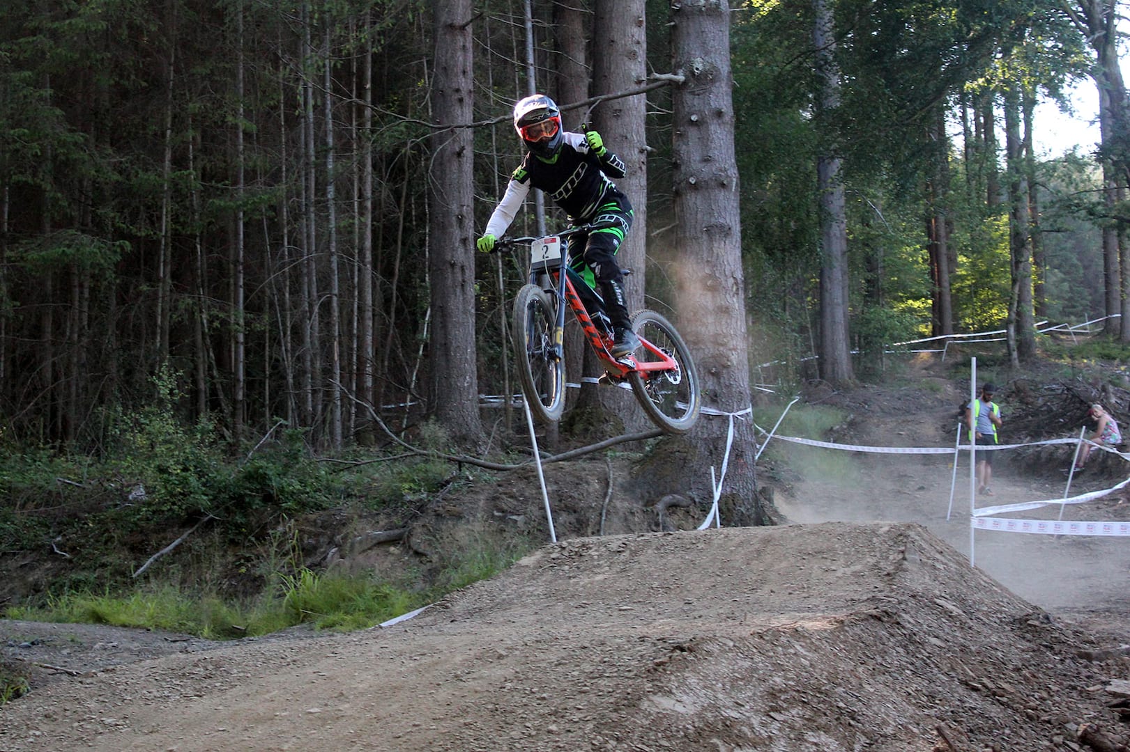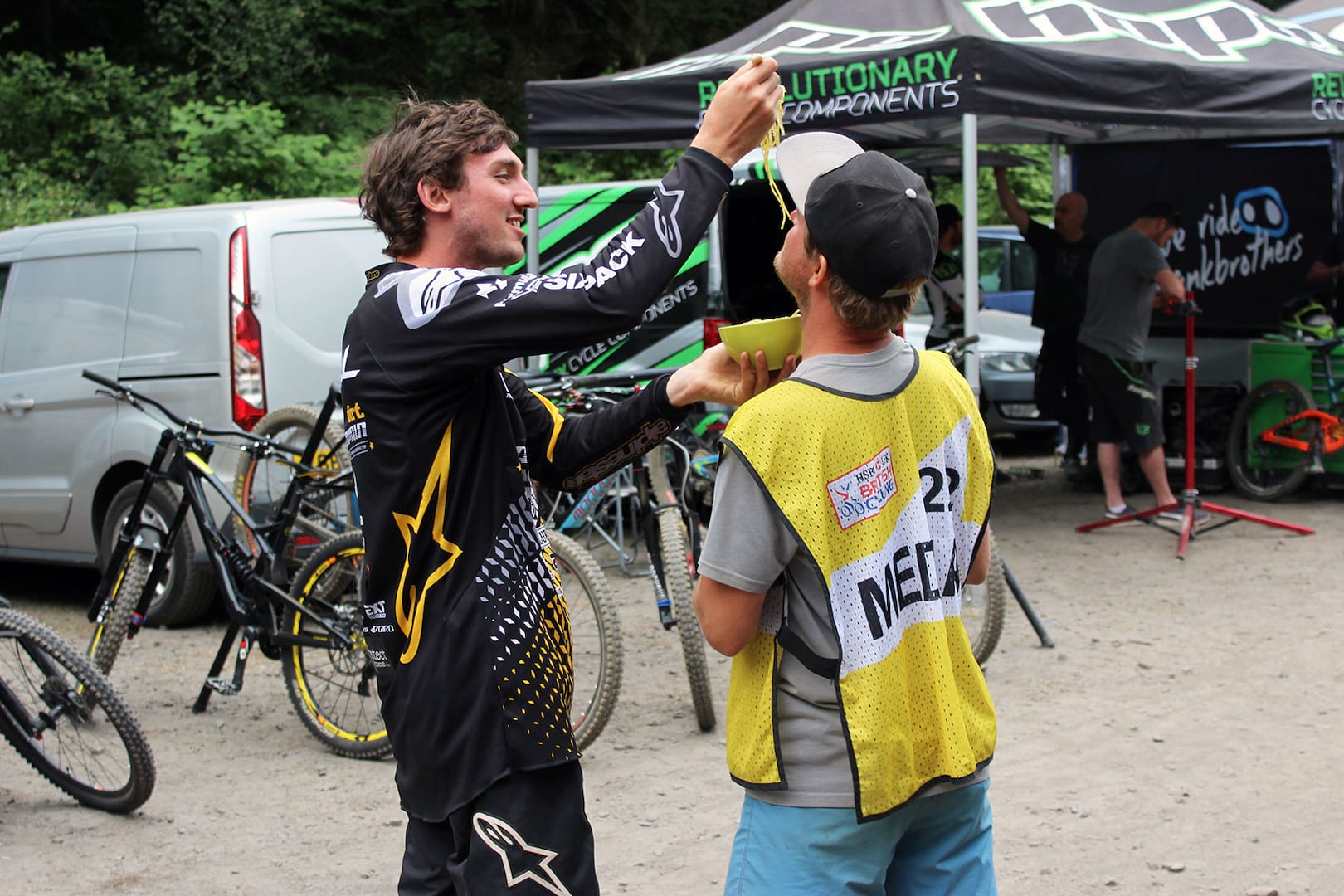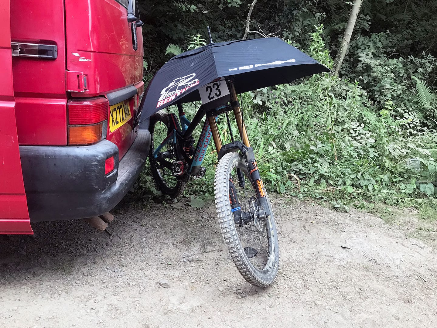 There were 17 Vets on the start list. By the time we get to race runs there’s only nine left. I’ve seeded eighth but if I hadn’t stopped I would’ve been seventh. James Davies seeded fourth but he’s in the ambulance on the way to hospital with Lindsay and her broken leg and won’t race so I’m potentially sixth. Christ, all I need is to repeat that and someone have a crash or a mechanical and I’m on the bloody box. At a National. This can’t be happening! We see Steve Jones who’s seeded fifth chatting to his family. His baby daughter’s crying; the course closure whilst they get Lindsay off the hill means they’re going home and she’s not going to get to see daddy race. I spend ages trying to convince him that he should go with them “it’s the right thing to do”. But he doesn’t and none of the others leave or crash either. We race in what feels like the only rain shower of the summer which makes the track super slippy. After nearly ending myself on the top section I make it down steadily and finish in seventh. Big congrats to Marky Neal who held it together and took the win in Vets with Tim Ponting in second and Weightman third.