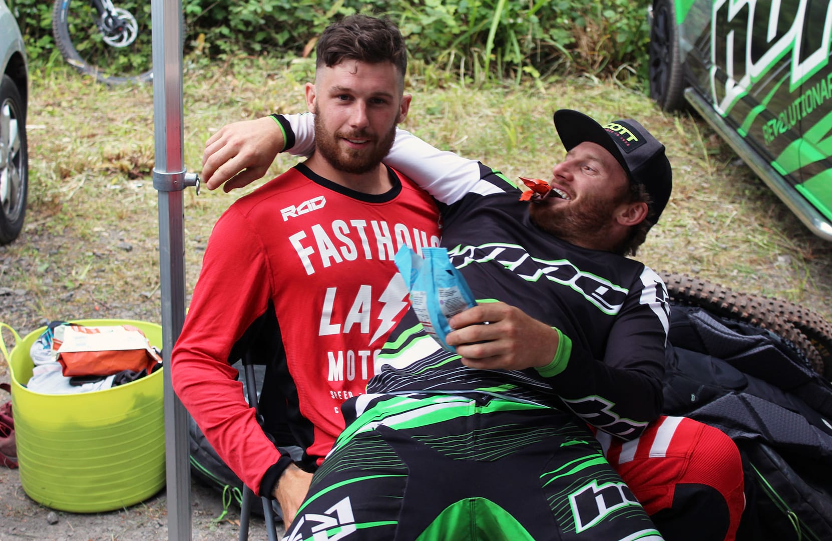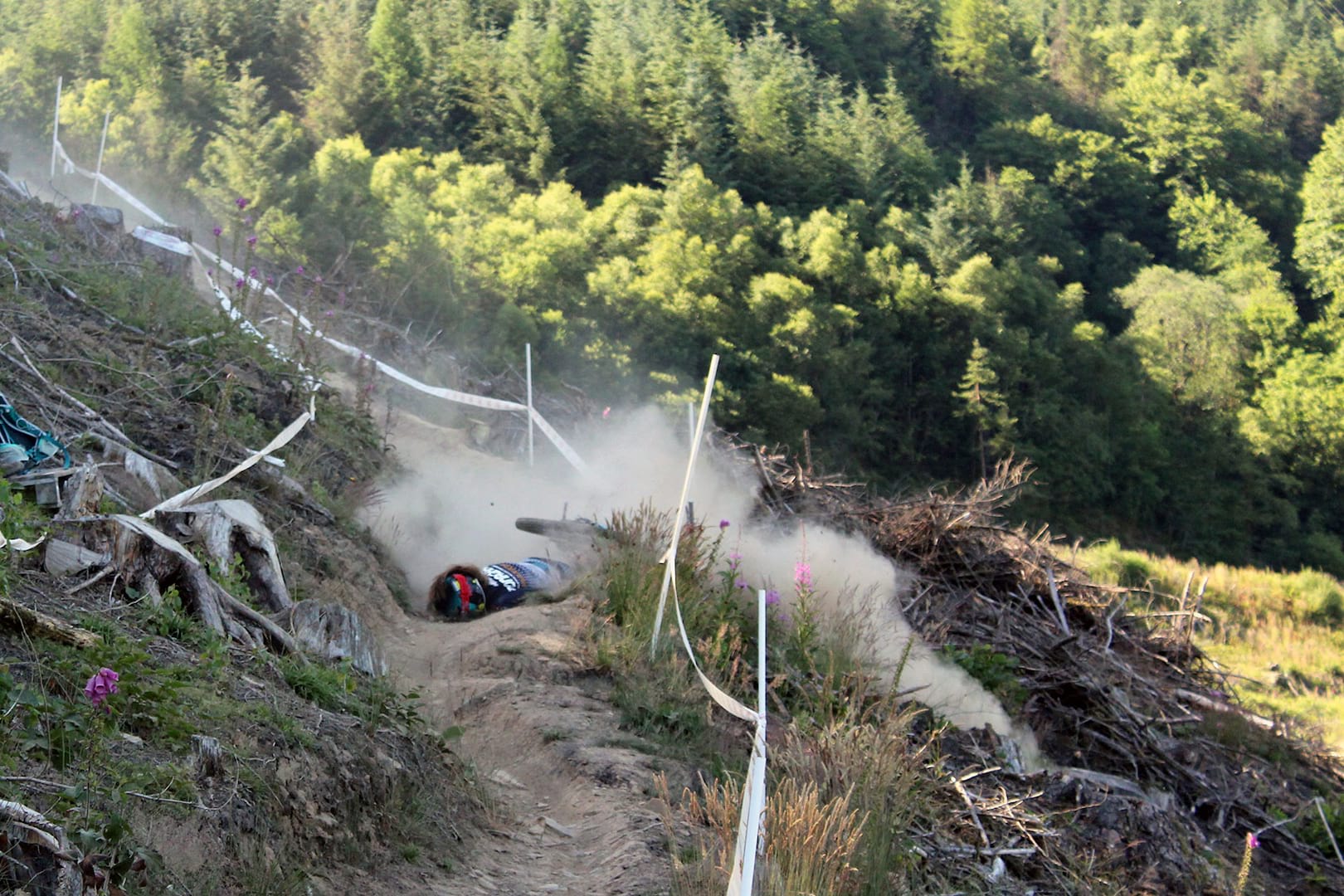 By the middle of the afternoon we’ve chalked up seven runs and I’m starting to feel it a bit. I ‘um and ah’ about an eighth and eventually go up for it but as we reach the top there’s a big course hold so I make my way back down in the Land Rover. After a 90-minute wait I’m in position to take some photos by the time the course is cleared. With nearly the entire field sat at the top cooling down and losing their rhythm there are more crashes as soon as it reopens. Chris Whitfield’s annoyed with himself after separating his shoulder; he’d been riding with the fast Hope boys all day and then one cruisy run where he stops paying attention ends his Andorra dreams as well. Rosy Monaghan has a big one right in front of me and Snowy Taylor nearly ends himself as well.