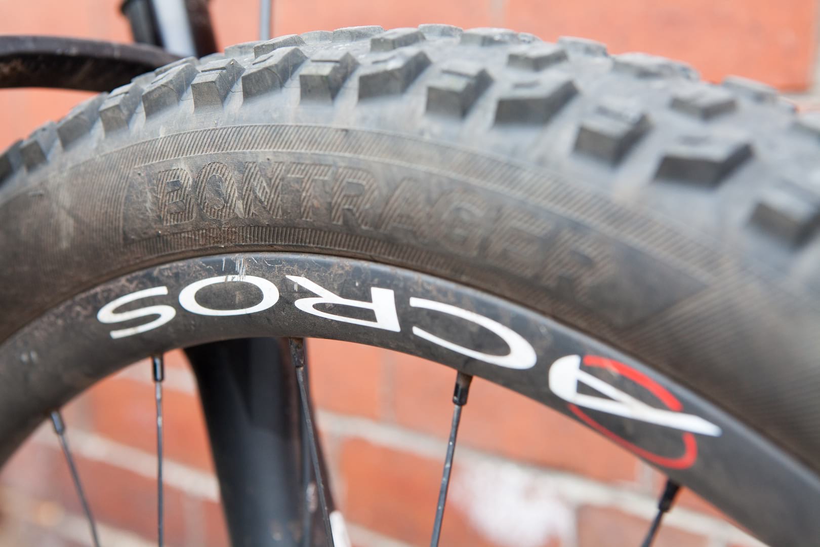 Working from the outside in, the Acros carbon rims are asymmetrically drilled “to offer better spoke tension and optimise the wheel’s stability”. The rim’s internal width is 29mm – not as wide as some, but a long way off being narrow. I reckon around the 30mm width, as these are, is about the Goldilocks size for my riding. It provides ample support for tyres from 2.3in up to the whopping 2.6in Bontrager XR4s I used for most of the test period, without squaring off the tyre profile too much.