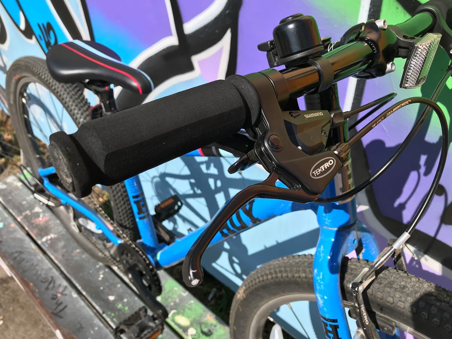 To achieve its target weight, Hoy has specced foam grips and a foam padded saddle, lightweight inner tubes, lighter bar, stem and seat-post, and low-spoke wheels. The foam saddle seems to me to be rather unsuccessful, with both my children complaining they found it hard and uncomfortable. While I had misgivings about the foam grips, they’re a hit with our seven year old tester, Rafe, who declares them soft and comfortable. He is a reasonably careful bike owner – not prone to dropping it on the ground, but will instead prop it carefully against whatever is to hand – so the grips haven’t been put through too much abuse. I had worried that they’d chip and dent like a swimming pool float, but so far there’s no evidence of that. I’d also worried that they might absorb water and become either smelly or uncomfortable, but since I’m not cruel/dedicated enough to force my kids on any prolonged wet riding slogs I can’t say whether this concern is founded.