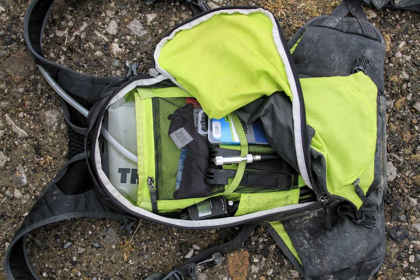The Vital 8’s storage is primarily defined by a large zippered main compartment, with internal dividers and zippered mesh pockets providing useful stowage. The segregated storage isn’t too complex though, so you don’t need a first class degree in origami just to put stuff in your bag. There are two barrel sleeves on either side – perfect for a mini-pump and a shock pump. I stuffed the additional pockets with snacks, a tubeless tyre repair kit, levers, and small spares. These pockets aren’t quite big enough for a tube though, so I left that and a pressure gauge loose in the bottom of the compartment.
