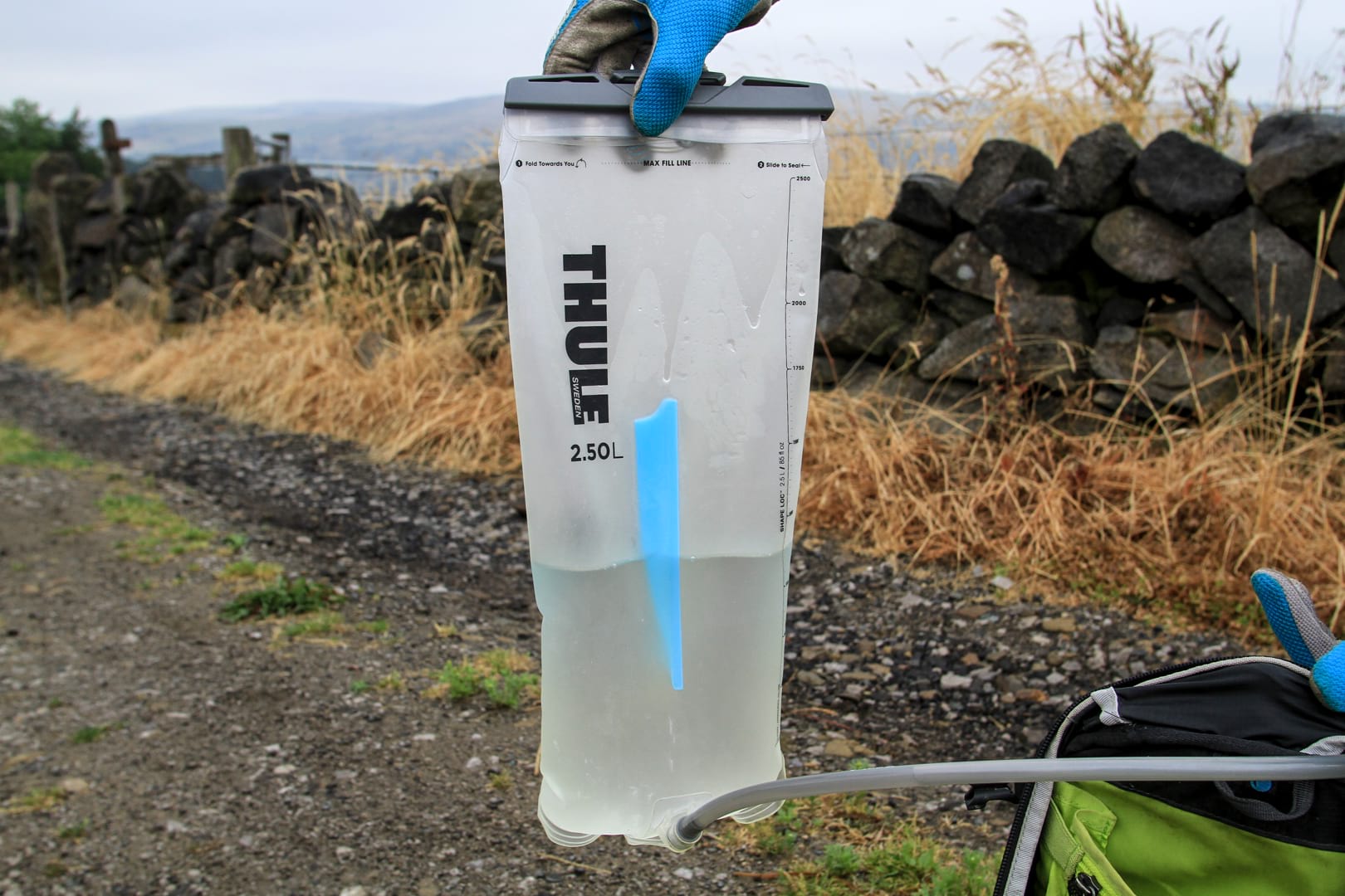 The thin-walled Hydrapak bladder sits inside its own dedicated sleeve behind the main storage compartment, with a small strap hoisting it vertically. In use, it’s fiddly to take out and refill, since the retaining strap is tight and inflexible. Once you’ve managed to unhook it, a slide tab comes off the bladder to reveal a wide-mouth opening that allows for easy refilling and cleaning. Unfortunately the hose isn’t detachable, so I had to rest the whole pack on the sink while I filled up the reservoir. I still don’t think Hydrapak’s bite valve is as good as Camelbak’s, with less flow available through the tube, and a more specific bite technique is required before you’re rewarded with fluids. It works fine though.