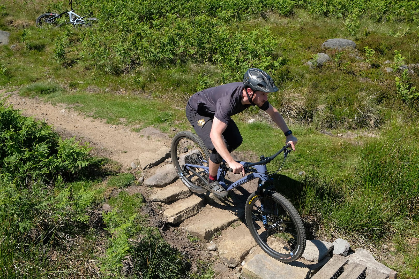 The lower link pocket has been widened, thanks to a lack of front mech provision. There’s space for a bottle cage, with a second under the downtube. Weight for the CC frame with Fox DPX2 shock is a round 2.5kg on the nose.