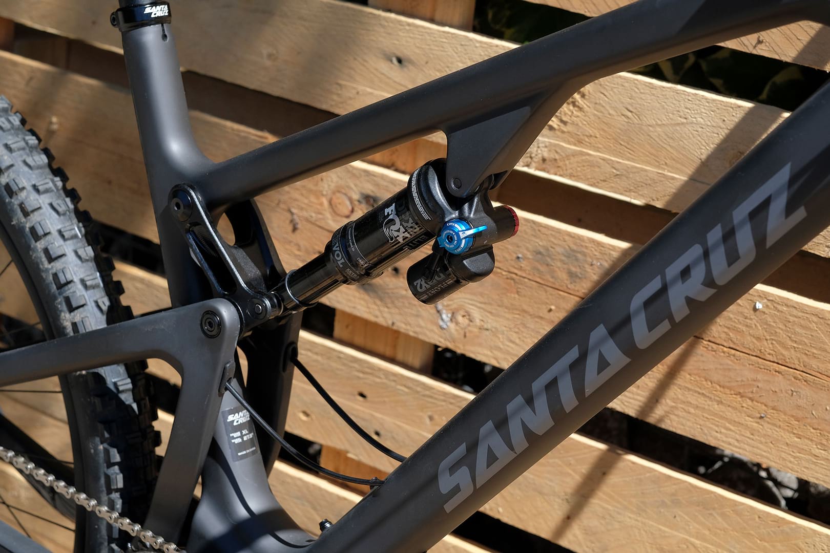 While not changing travel for next year, the whole bike has been beefed up and stiffened up. The swingarm now has two upright supports to properly box in the rear triangle, along with a much wider, stiffer (threaded) BB area. There’s no longer a facility for front mechs, this bike is one-by only. As with the Bronson, the bike is longer (+15mm reach), the head angle is 0.5° slacker (to 66.2° on the slacker setting) and the seat angle steepens a touch to 65°. There is a ‘flip chip’ that alters head angle slightly (by 0.3°) but its main job is to lower the BB height if you’re running bigger tyres – and it’ll take tyres up to 2.8in, though Santa Cruz will be speccing (optional) 2.6in tyres for a less dramatic plus tyre experience. (’27 Plump’ it is calling the 2.6 size – something we refer to here as ‘British Plus’.