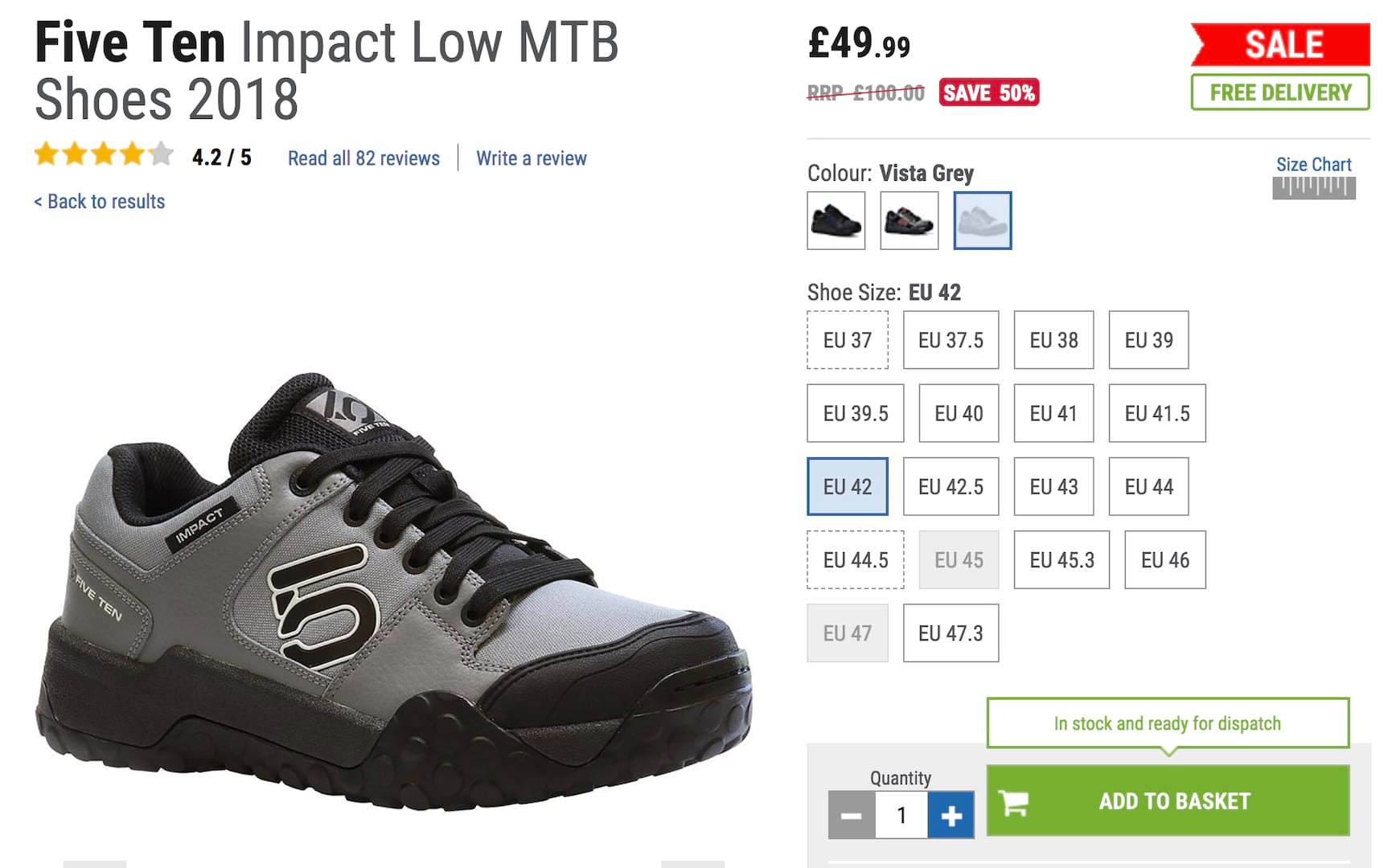 CRC has updated it’s summer sale today and one of the hottest items we’ve seen is this deal on Five Ten Impact Low MTB shoes. The sale lists the shoe as from £49.99 with 3 colour options available, but we’ve only found that the grey colour option can be had at that super low price.
