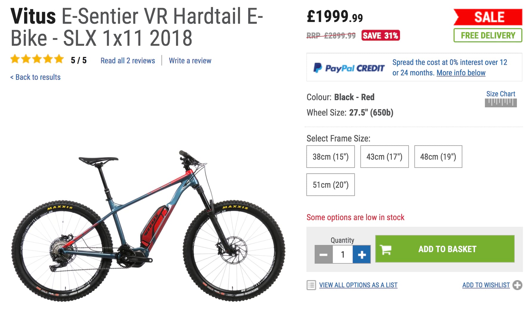 The current sale price for the Vitus E-Sentier is just £1999.99 with all sizes listed as in stock, but remember that if you’re a member of British Cycling you will receive an extra 10% off bring the cost down to only £1799.99!